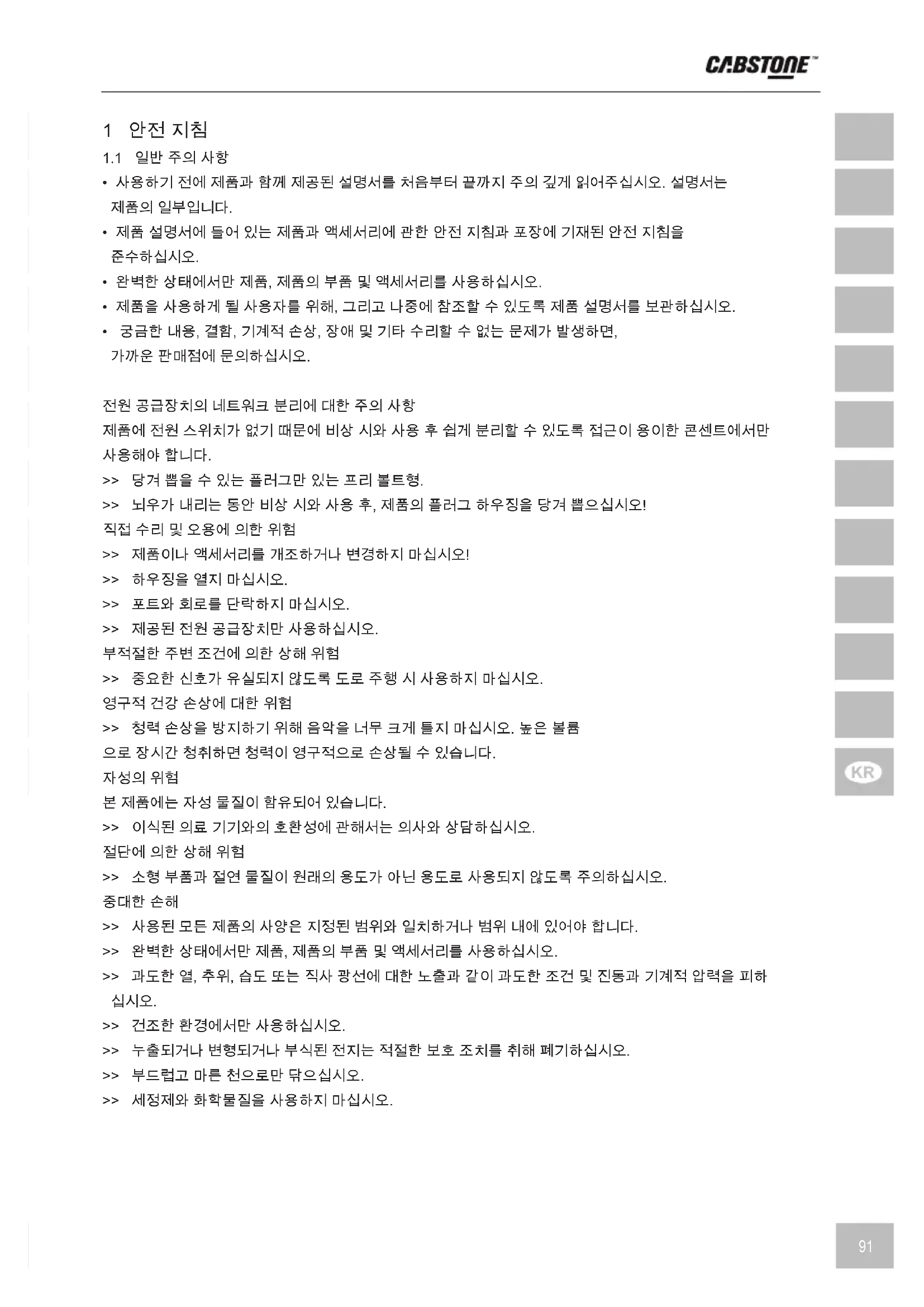 10 유지 보수, 관리, 보관 및 운반 >> 부드럽고 마른 천으로만 닦으십시오. >> 세정제와 화학물질을 사용하지 마십시오. >> 장기간 사용하지 않을 경우, 제품을 3개월마다 충전하여 용량을 유지하십시오. >> 서늘하고 건조한 상태로 보관하십시오. >> 원래의 포장재를 보관하고 운반 시 사용하십시오. 11 폐기물 처리에 관한 유의사항 유럽 WEEE 지침에 따라 전기전자장치는 가정용 폐기물과함께 버리지 않아야 합니다. 법에 따라 소비자는 장치 수명 이 다할 경우 전기전자장 치를 공공 수거시설 또는 딜러에게무상으 로 제공해야 합니다. 구체적인 사항은 해당 국가의 규 정에 정해져 있습니다. 제품, 설명서 또 는 포장에 표시된기 호는 이러한 조건을 나타냅니다. 사용한 장치를 이런 방식으로 폐기하여 환경 보호책임을 공유하게 됩니다. 12 적합성 EU 선언 CE 기호 Cabstone