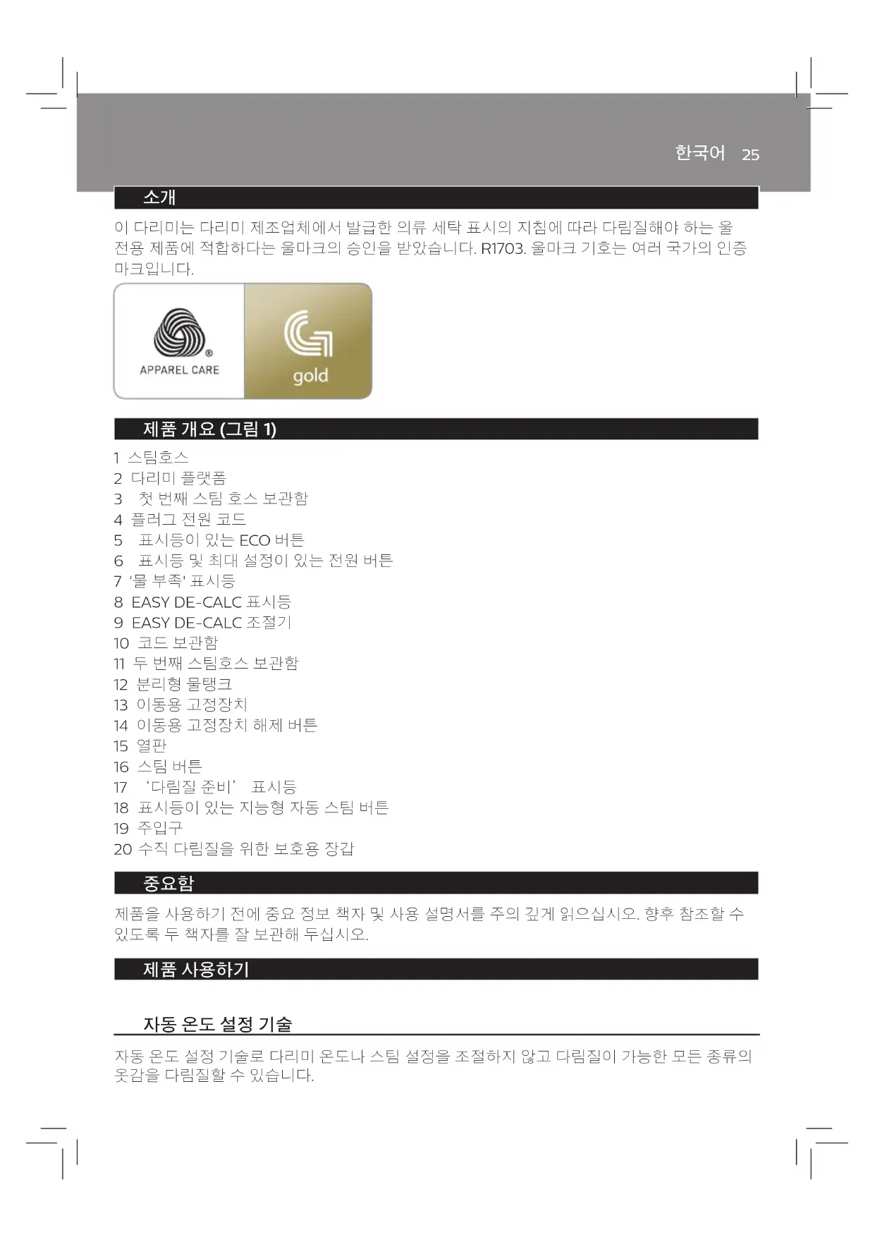 제품 개요 (그림 1) 1 스팀호스 2 다리미 플랫폼 3 첫 번째 스팀 호스 보관함 4 플러그 전원 코드 5 표시등이 있는 ECO 버튼 6 표시등 및 최대 설정이 있는 전원 버튼 7 '물 부족' 표시등 8 EASY DE-CALC 표시등 9 EASY DE-CALC 조절기 10 코드 보관함 11 두 번째 스팀호스 보관함 12 분리형 물탱크 13 이동용 고정장치 14 이동용 고정장치 해제 버튼 15 열판 16 스팀 버튼 17 ‘다림질 준비’ 표시등 18 표시등이 있는 지능형 자동 스팀 버튼 19 주입구 20 수직 다림질을 위한 보호용 장갑