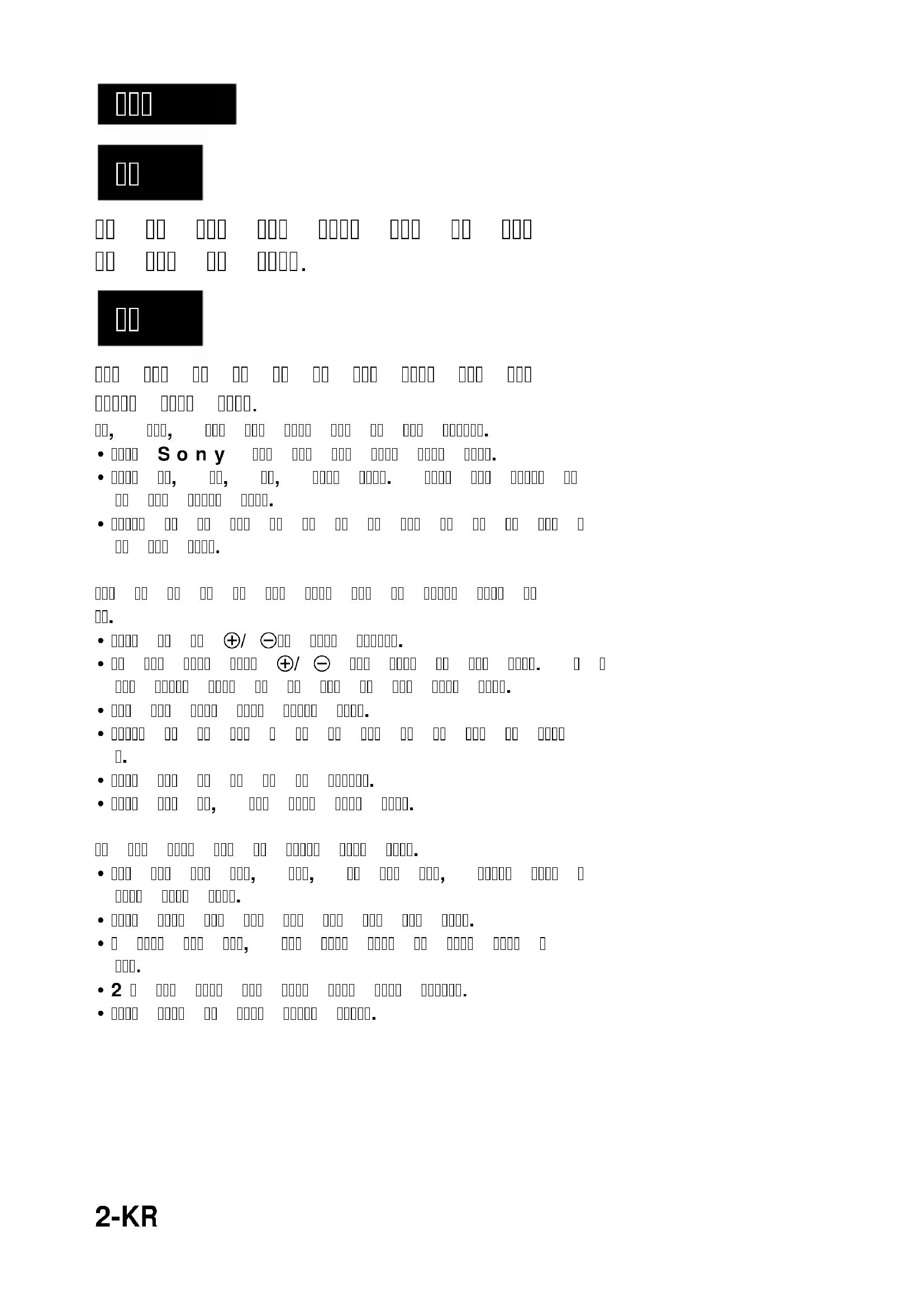 - 배터리 충전기를 수리할 때는 전원 플러그를 빼두십시오. 문제가 발생했을 때는 기기의 플러그를 빼고 가까운 Sony 대리점에 문의하 십시오.8-KR 니켈-금속 하이브리드 배터리를 사용합니다