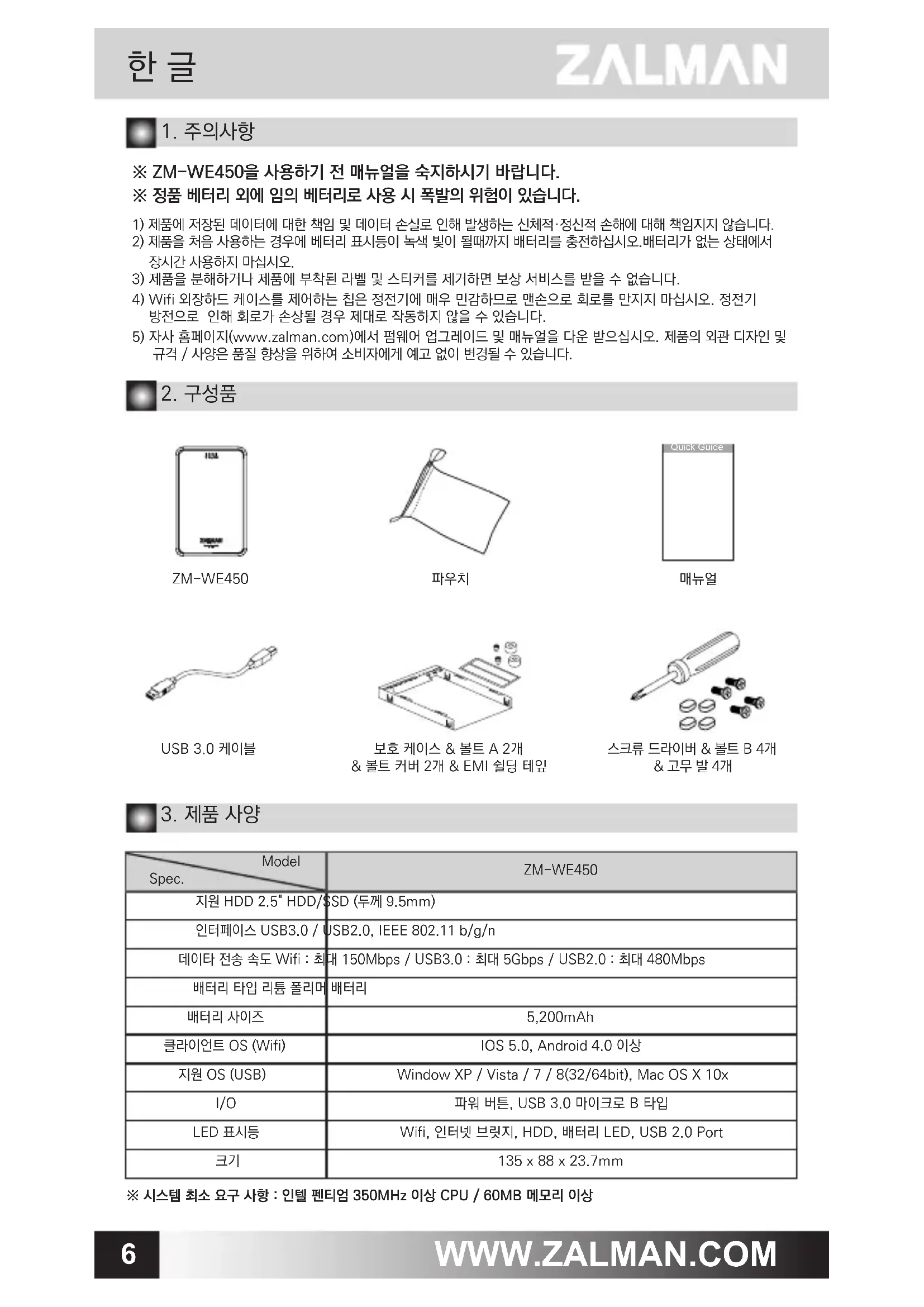 ※ 시스템 최소 요구 사항 : 인텔 펜티엄 350MHz 이상 CPU / 60MB 메모리 이상 Model Spec. ZM-WE450 지원 HDD 2.5" HDD/SSD (두께 9.5mm) 인터페이스 USB3.0 / USB2.0, IEEE 802.11 b/g/n 데이타 전송 속도 Wifi : 최대 150Mbps / USB3.0 : 최대 5Gbps / USB2.0 : 최대 480Mbps 배터리 타입 리튬 폴리머 배터리