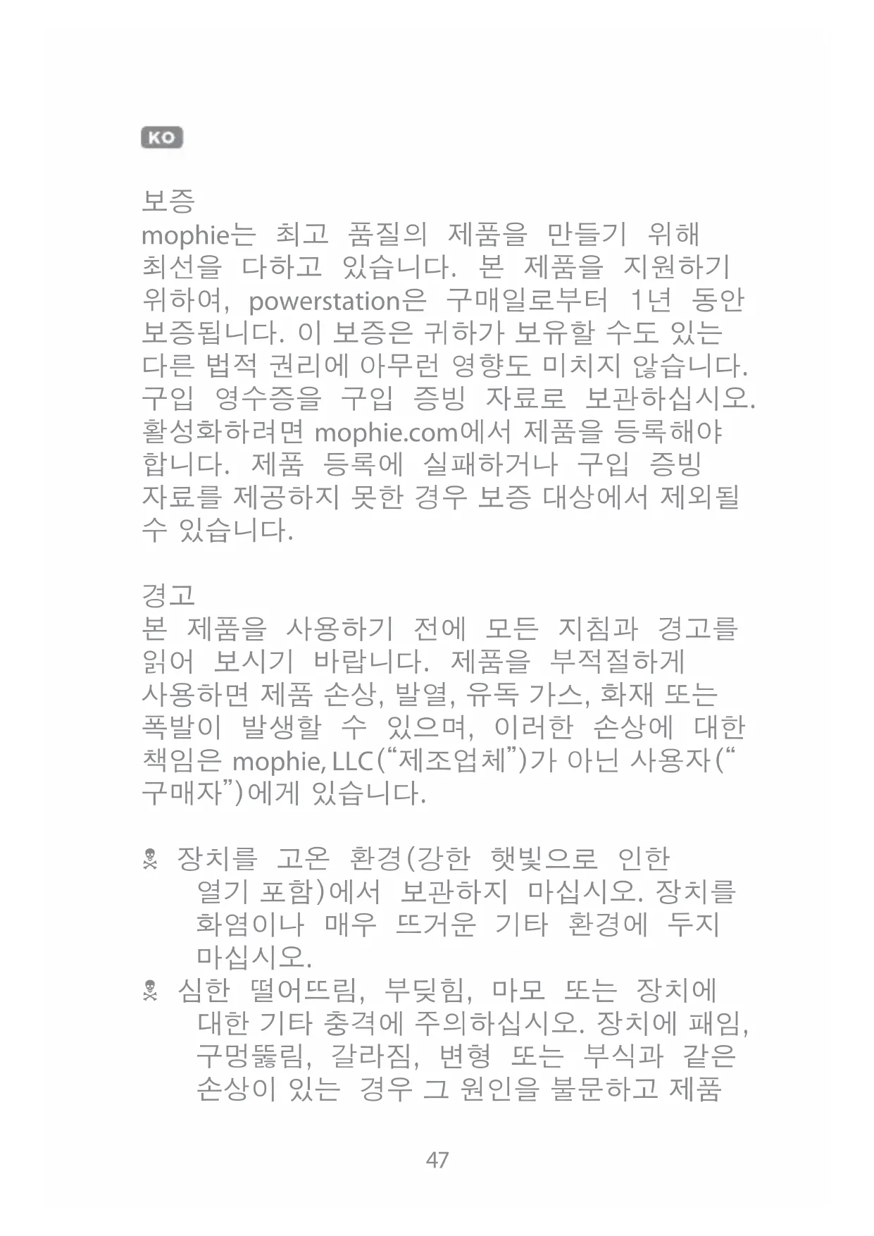 mophie는 최고 품질의 제품을 만들기 위해 최선을 다하고 있습니다. 본 제품을 지원하기 위하여, powerstation은 구매일로부터 1년 동안 보증됩니다. 이 보증은 귀하가 보유할 수도 있는 다른 법적 권리에 아무런 영향도 미치지 않습니다. 구입 영수증을 구입 증빙 자료로 보관하십시오. 활성화하려면 mophie.com에서 제품을 등록해야 합니다. 제품 등록에 실패하거나 구입 증빙 자료를 제공하지 못한 경우 보증 대상에서 제외될