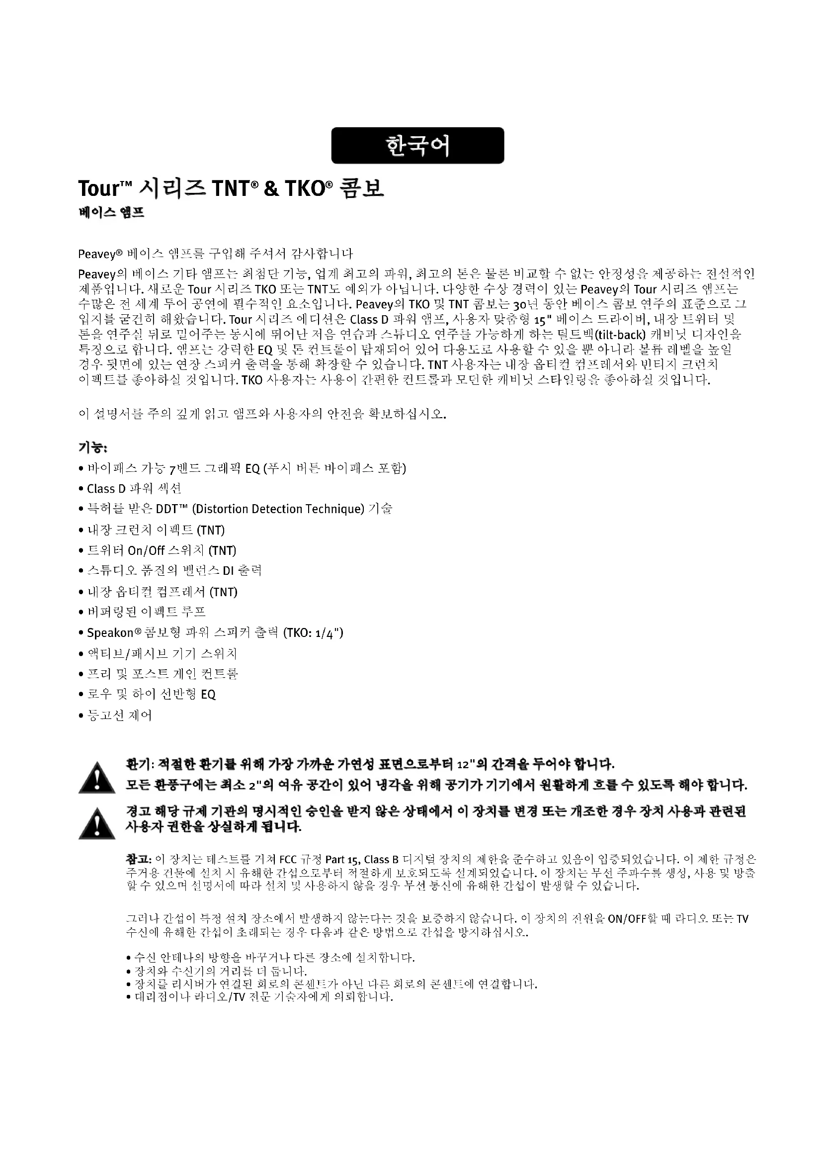베이스 앰프를 구입해 주셔서 감사합니다 Peavey의 베이스 기타 앰프는 최첨단 기능, 업계 최고의 파워, 최고의 톤은 물론 비교할 수 없는 안정성을 제공하는 전설적인 제품입니다. 새로운 Tour 시리즈 TKO 또는 TNT도 예외가 아닙니다. 다양한 수상 경력이 있는 Peavey의 Tour 시리즈 앰프는 수많은 전 세계 투어 공연에 필수적인 요소입니다. Peavey의 TKO 및 TNT 콤보는 30년 동안 베이스 콤보 연주의 표준으로 그 입지를 굳건히 해왔습니다. Tour 시리즈 에디션은 Class D 파워 앰프, 사용자 맞춤형 15" 베이스 드라이버, 내장 트위터 및 톤을 연주실 뒤로 밀어주는 동시에 뛰어난 저음 연습과 스튜디오 연주를 가능하게 하는 틸트백(tilt-back) 캐비닛