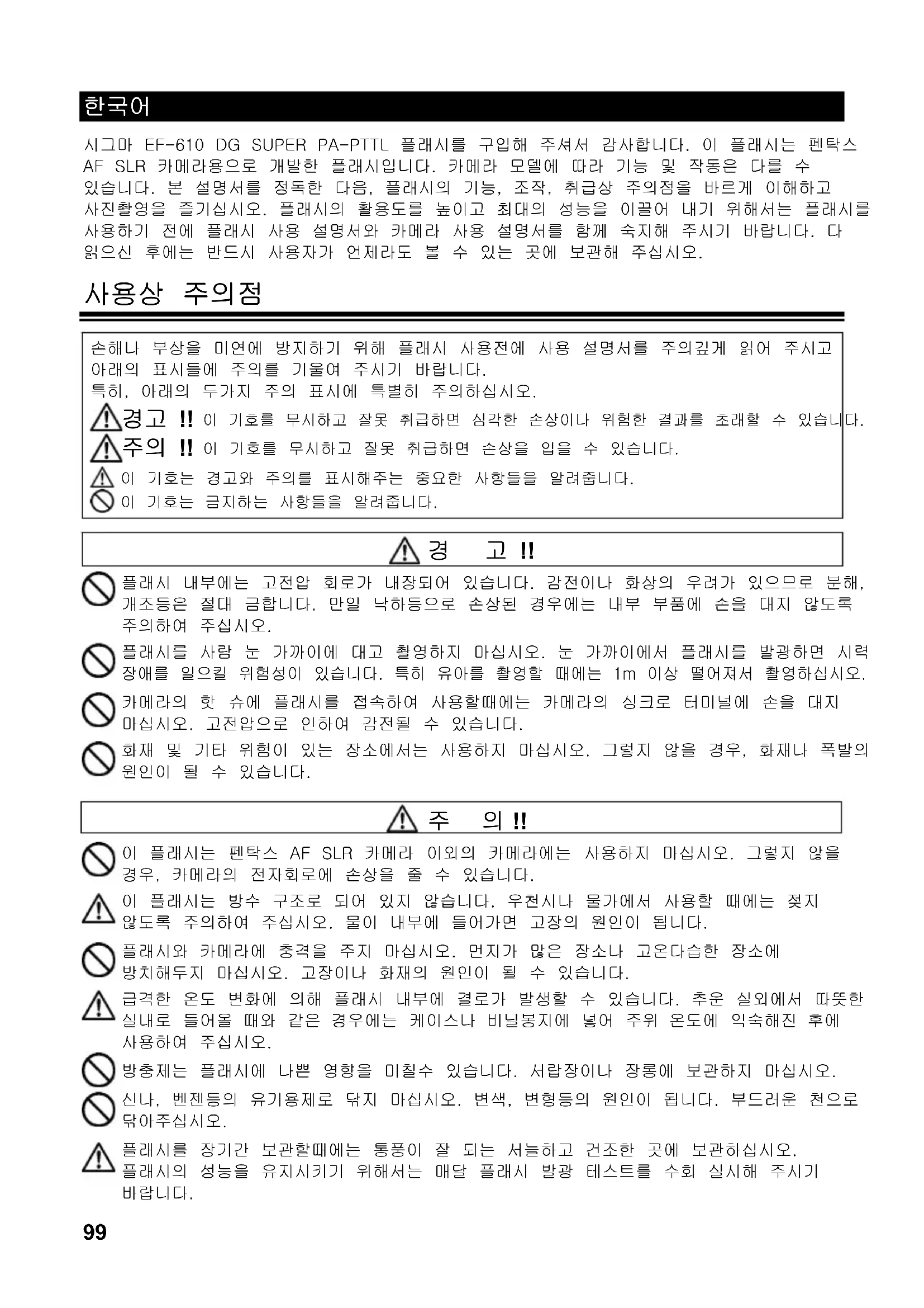 시그마 EF-610 DG SUPER PA-PTTL 플래시를 구입해 주셔서 감사합니다. 이 플래시는 펜탁스 AF SLR 카메라용으로 개발한 플래시입니다. 카메라 모델에 따라 기능 및 작동은 다를 수 있습니다. 본 설명서를 정독한 다음, 플래시의 기능, 조작, 취급상 주의점을 바르게 이해하고 사진촬영을 즐기십시오. 플래시의 활용도를 높이고 최대의 성능을 이끌어 내기 위해서는 플래시를 사용하기 전에 플래시 사용 설명서와 카메라 사용 설명서를 함께 숙지해 주시기 바랍니다. 다 읽으신 후에는 반드시 사용자가 언제라도 볼 수 있는 곳에 보관해 주십시오.