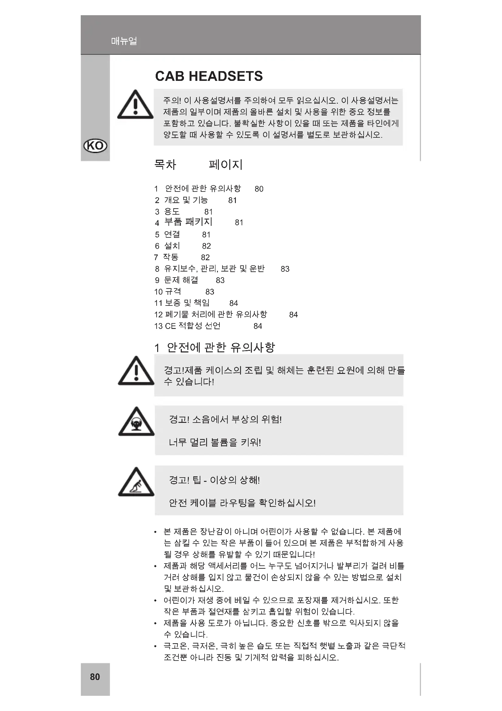 ZH79 ZH80 주의! 이 사용설명서를 주의하여 모두 읽으십시오. 이 사용설명서는 제품의 일부이며 제품의 올바른 설치 및 사용을 위한 중요 정보를 포함하고 있습니다. 불확실한 사항이 있을 때 또는 제품을 타인에게 양도할 때 사용할 수 있도록 이 설명서를 별도로 보관하십시오. CAB HeAdSeTS