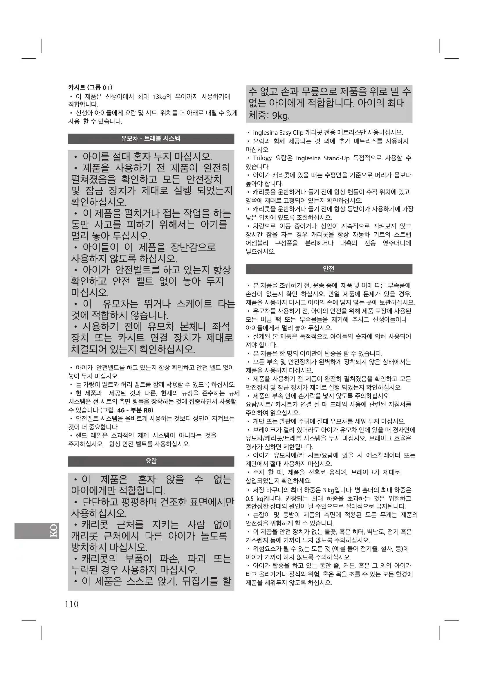 중요 - 제품 사용 전 매뉴얼을 꼼꼼히 읽어 보시고, 나중에 참조 할 수 있도록 잘 보관 하시길 바랍니다. 여기에 적힌 지침들을 따르지 않을 경우 아이의 안전에 영향을 초래할 수 있습니다. 아이의 안전은 사용자의 책임입니다. 경고! 아이를 절대 혼자 두지 마십시오. 위험할 수 있습니다. 특히 제품을 사용 중일 때 더 많은 신경을 써주십시오.109
