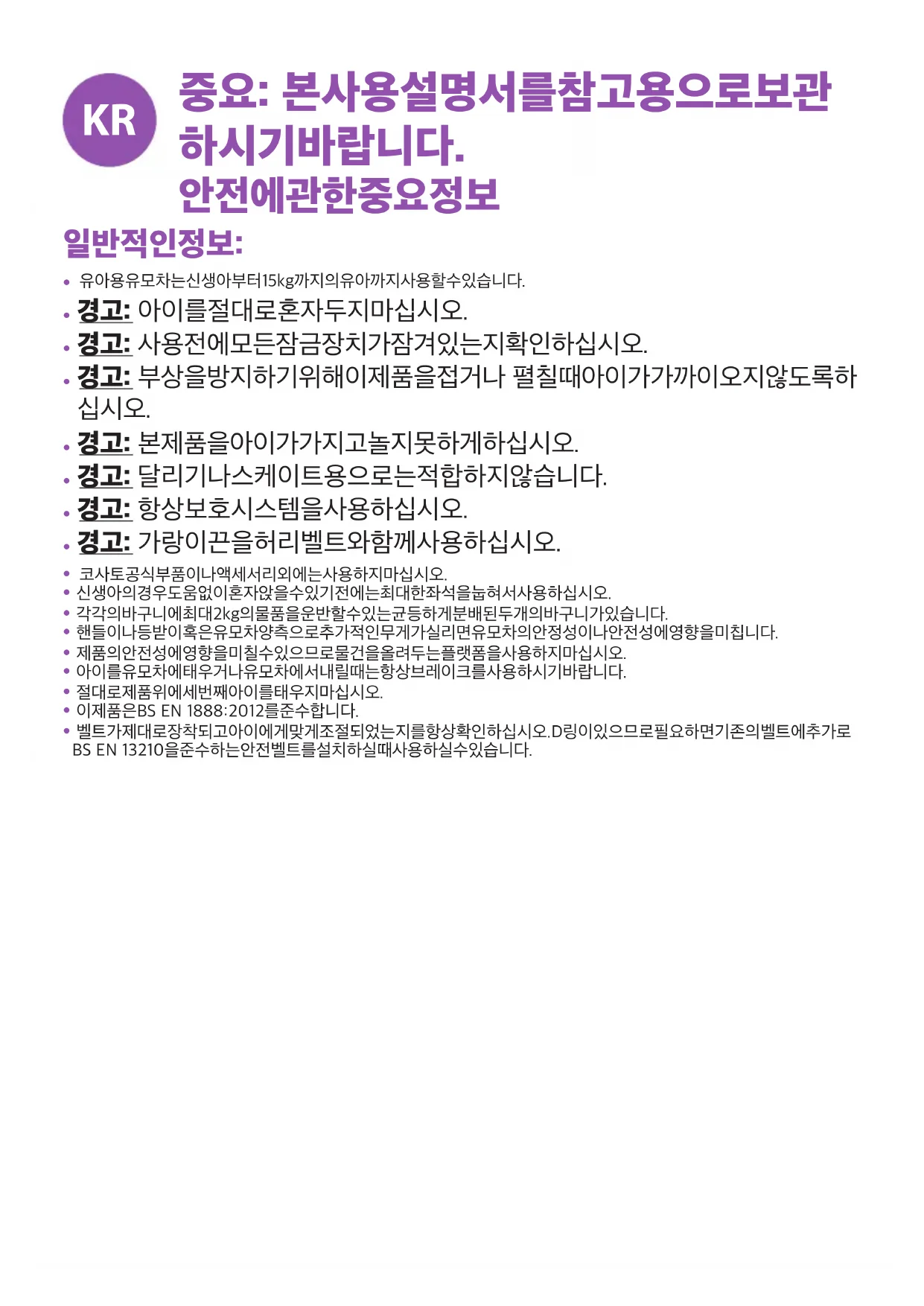 - 구매하신 유모차는 안전기준에 충족하도록 설계되었으며 올바른 사용 및 유지관리 시 오랫동안 뛰어난 성능을 발휘