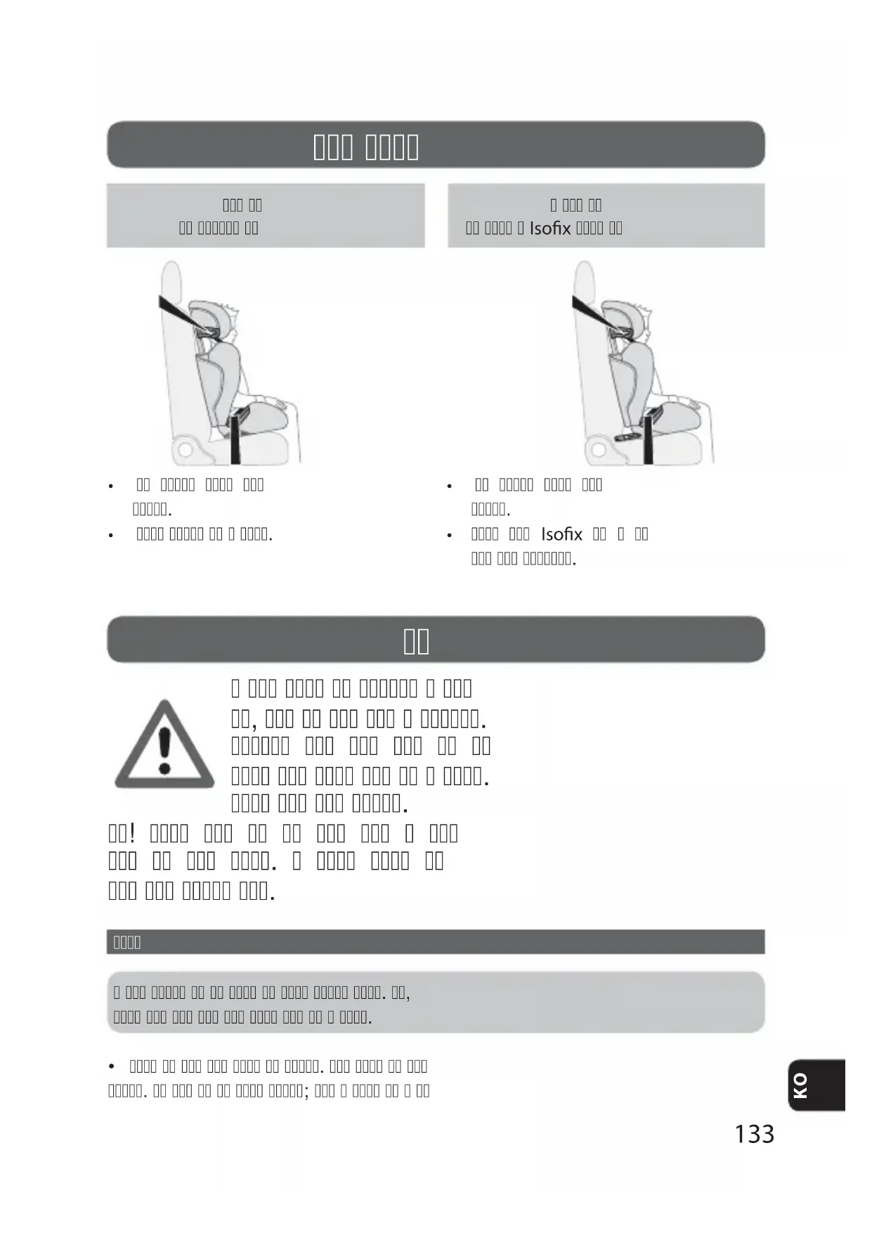카시트의 설치는 제공된 사용설명서의 지시사항에 따라 철저히 해주십시요. 지시사항을 제대로 지키지 않은 경우는 여러분의 자녀에게 위험한 결과를 가져올 수 있습니다.