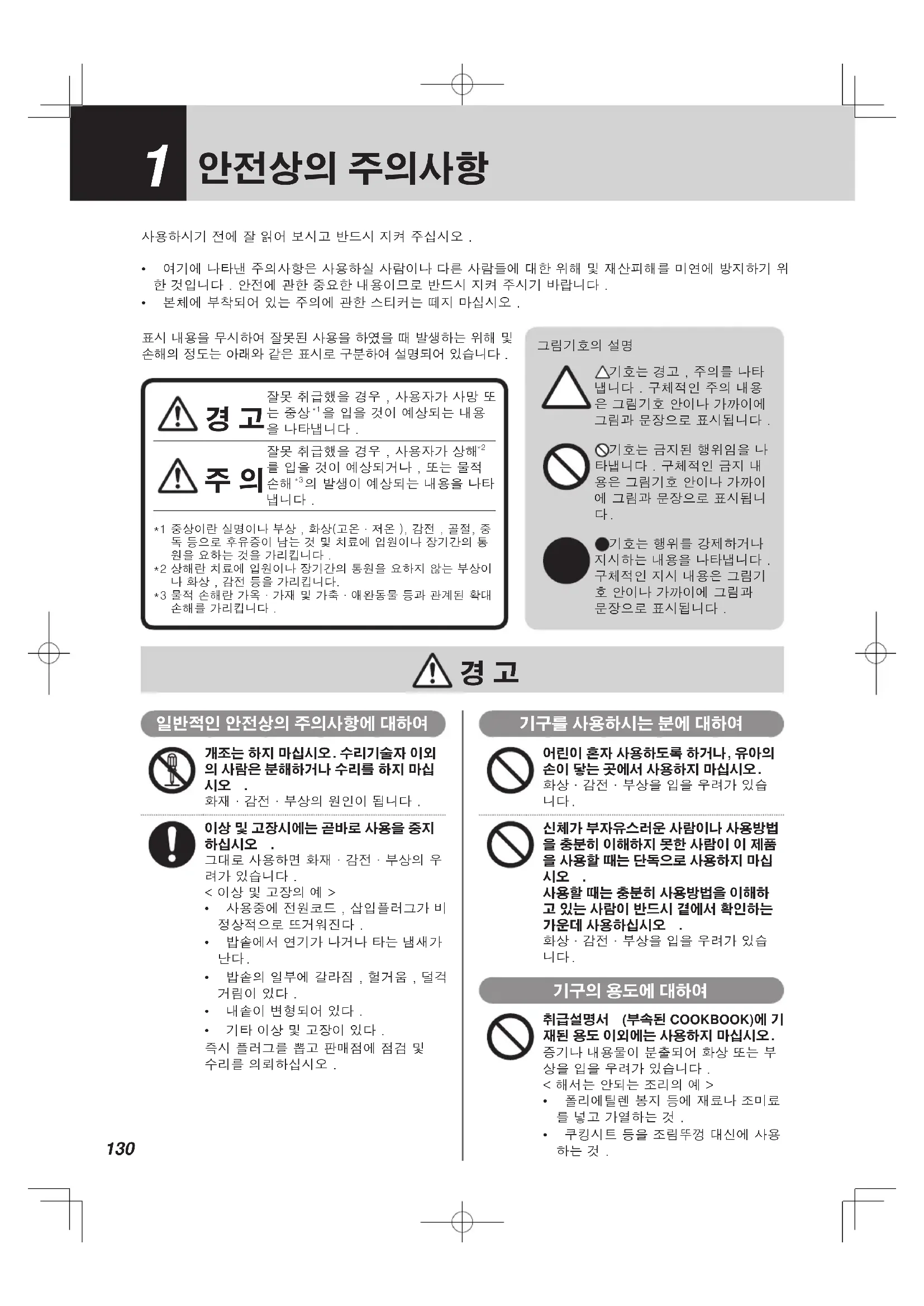 기구의 용도에 대하여 취급설명서 (부속된 COOKBOOK)에 기 재된 용도 이외에는 사용하지 마십시오 . 증기나 내용물이 분출되어 화상 또는 부상을 입을 우려가 있습니다 .< 해서는 안되는 조리의 예 >• 폴리에틸렌 봉지 등에 재료나 조미료를 넣고 가열하는 것 .• 쿠킹시트 등을 조림뚜껑 대신에 사용하는 것 .사용하시기 전에 잘 읽어 보시고 반드시 지켜 주십시오 .• 여기에 나타낸 주의사항은 사용하실 사람이나 다른 사람들에 대한 위해 및 재산피해를 미연에 방지하기 위한 것입니다 . 안전에 관한 중요한 내용이므로 반드시 지켜 주시기 바랍니다 .• 본체에 부착되어 있는 주의에 관한 스티커는 떼지 마십시오 .표시 내용을 무시하여 잘못된 사용을 하였을 때 발생하는 위해 및 손해의 정도는 아래와 같은 표시로 구분하여 설명되어 있습니다 . 잘못 취급했을 경우 , 사용자가 사망 또