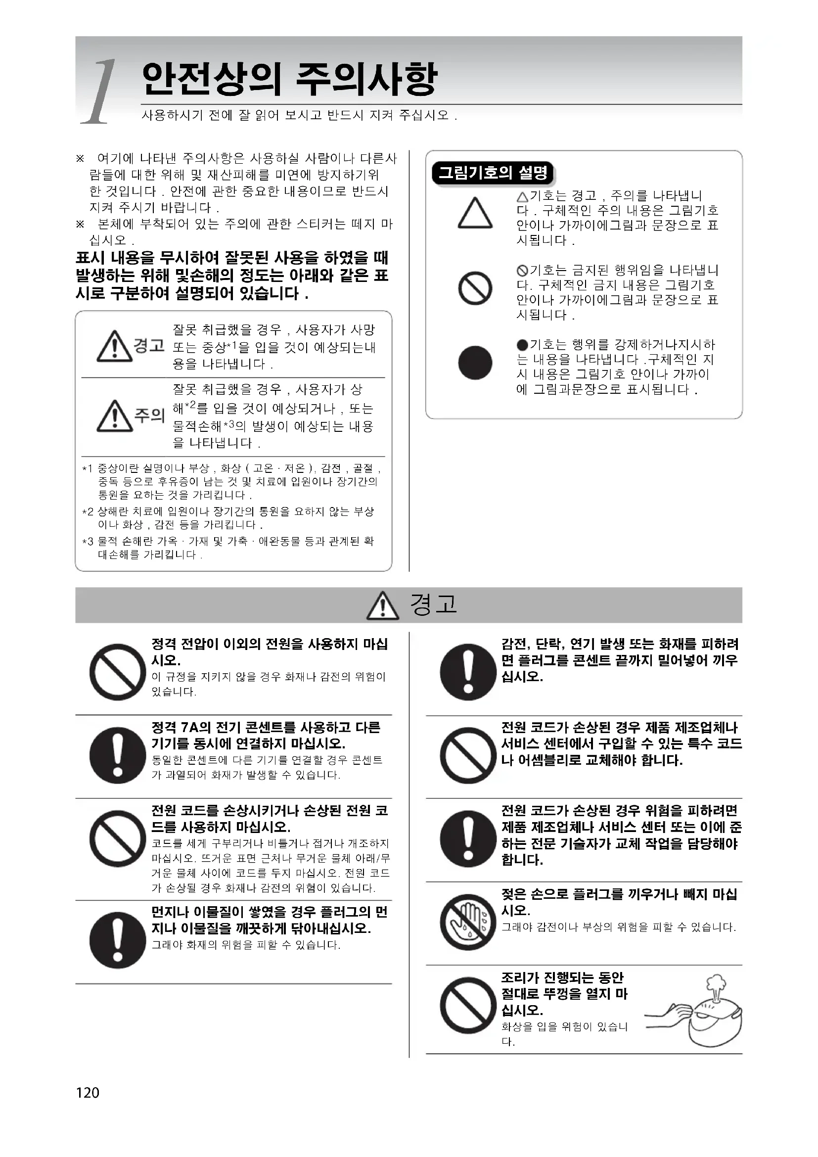 의 발생이 예상되는 내용을 나타냅니다 .*1 중상이란 실명이나 부상 , 화상 ( 고온·저온 ), 감전 , 골절 ,중독 등으로 후유증이 남는 것 및 치료에 입원이나 장기간의통원을 요하는 것을 가리킵니다 .*2 상해란 치료에 입원이나 장기간의 통원을 요하지 않는 부상이나 화상 , 감전 등을 가리킵니다 .*3 물적 손해란 가옥·가재 및 가축·애완동물 등과 관계된 확대손해를 가리킵니다 . 기호는 경고 , 주의를 나타냅니다 . 구체적인 주의 내용은 그림기호안이나 가까이에그림과 문장으로 표시됩니다 .기호는 금지된 행위임을 나타냅니다. 구체적인 금지 내용은 그림기호안이나 가까이에그림과 문장으로 표시됩니다 .기호는 행위를 강제하거나지시하는 내용을 나타냅니다 .구체적인 지시 내용은 그림기호 안이나 가까이에 그림과문장으로 표시됩니다 . 정격 전압이 이외의 전원을 사용하지 마십 이 규정을 지키지 않을 경우 화재나 감전의 위험이있습니다.정격 7A의 전기 콘센트를 사용하고 다른기기를 동시에 연결하지 마십시오.동일한 콘센트에 다른 기기를 연결할 경우 콘센트가 과열되어 화재가 발생할 수 있습니다.전원 코드를 손상시키거나 손상된 전원 코드를 사용하지 마십시오.코드를 세게 구부리거나 비틀거나 접거나 개조하지마십시오. 뜨거운 표면 근처나 무거운 물체 아래/무거운 물체 사이에 코드를 두지 마십시오. 전원 코드가 손상될 경우 화재나 감전의 위험이 있습니다.먼지나 이물질이 쌓였을 경우 플러그의 먼지나 이물질을 깨끗하게 닦아내십시오.그래야 화재의 위험을 피할 수 있습니다.감전, 단락, 연기 발생 또는 화재를 피하려면 플러그를 콘센트 끝까지 밀어넣어 끼우 전원 코드가 손상된 경우 제품 제조업체나서비스 센터에서 구입할 수 있는 특수 코드나 어셈블리로 교체해야 합니다.전원 코드가 손상된 경우 위험을 피하려면제품 제조업체나 서비스 센터 또는 이에 준하는 전문 기술자가 교체 작업을 담당해야 젖은 손으로 플러그를 끼우거나 빼지 마십 그래야 감전이나 부상의 위험을 피할 수 있습니다.조리가 진행되는 동안절대로 뚜껑을 열지 마 화상을 입을 위험이 있습니