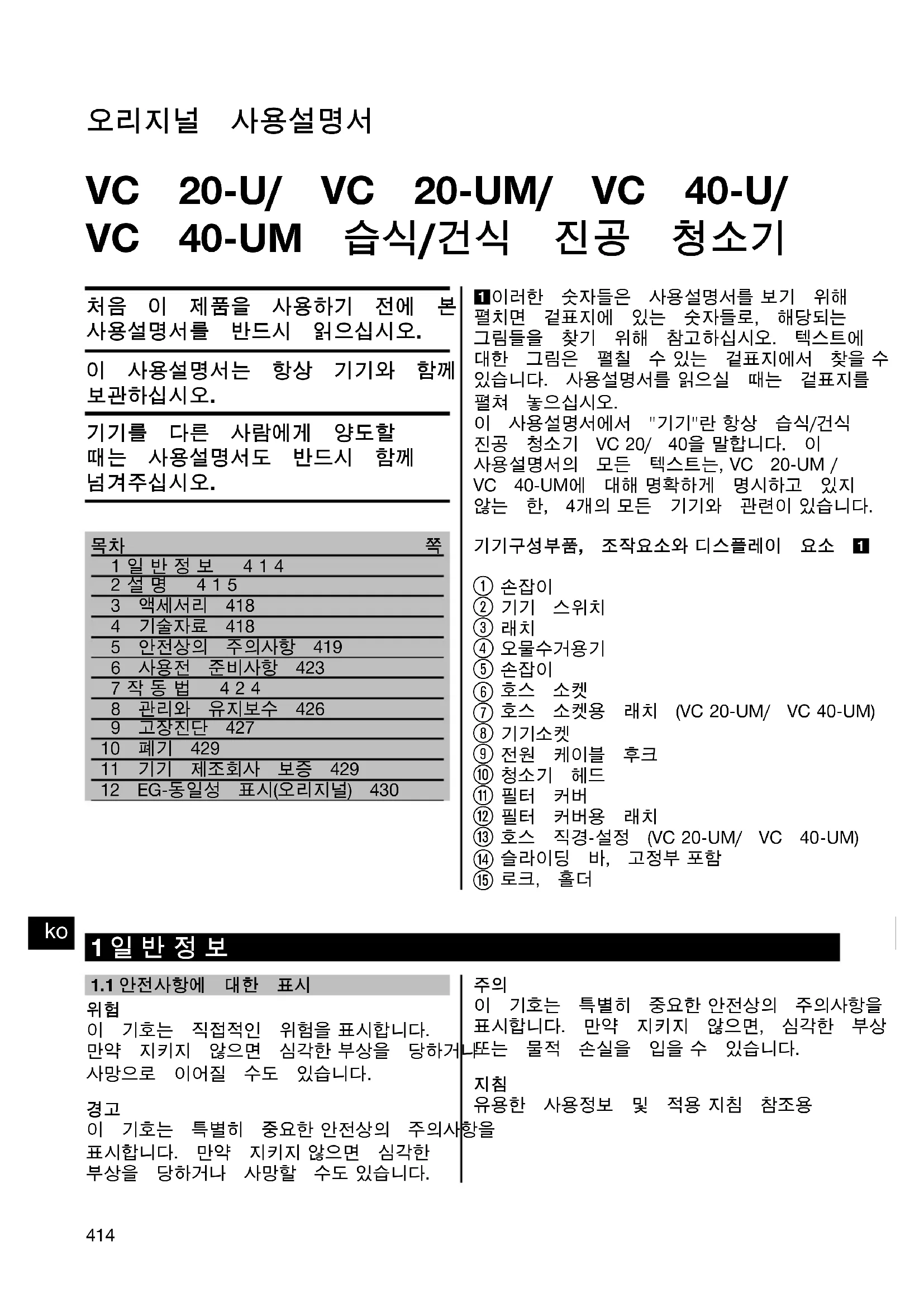 Printed: 08.07.2013 | Doc-Nr: PUB / 5071294 / 000 / 02오리지널 사용설명서 VC 20‑U/ VC 20‑UM/ VC 40‑U/ VC 40‑UM 습식/건식 진공 청소기 처음 이 제품을 사용하기 전에 본사용설명서를 반드시 읽으십시오.이 사용설명서는 항상 기기와 함께보관하십시오.기기를 다른 사람에게 양도할때는 사용설명서도 반드시 함께넘겨주십시오. 1일반정보 4142설명 4153 액세서리 4184 기술자료 4185 안전상의 주의사항 4196 사용전 준비사항 4237작동법 4248 관리와 유지보수 4269 고장진단 42710 폐기 42911 기기 제조회사 보증 42912 EG-동일성 표시(오리지널) 4301 이러한 숫자들은 사용설명서를 보기 위해펼치면 겉표지에 있는 숫자들로, 해당되는그림들을 찾기 위해 참고하십시오. 텍스트에대한 그림은 펼칠 수 있는 겉표지에서 찾을 수있습니다. 사용설명서를 읽으실 때는 겉표지를펼쳐 놓으십시오.이 사용설명서에서 "기기"란 항상 습식/건식진공 청소기 VC 20/ 40을 말합니다. 이사용설명서의 모든 텍스트는, VC 20‑UM /VC 40‑UM에 대해 명확하게 명시하고 있지않는 한, 4개의 모든 기기와 관련이 있습니다.기기구성부품, 조작요소와 디스플레이 요소 1