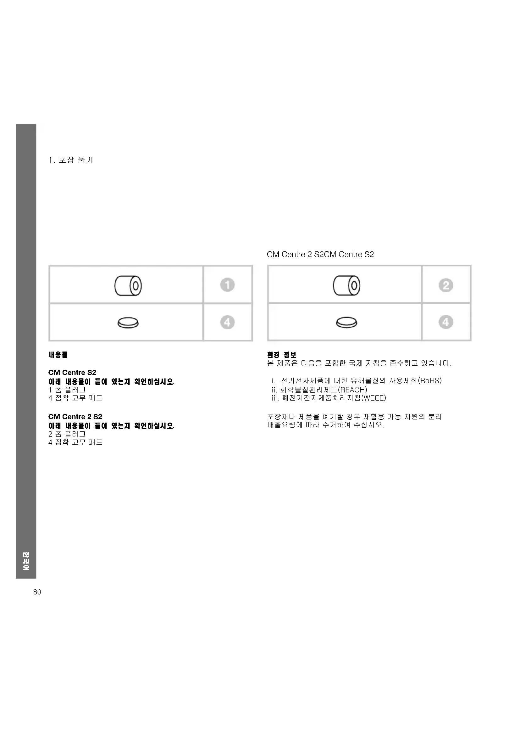 CM Centre S2 아래 내용물이 들어 있는지 확인하십시오. 1 폼 플러그 4 점착 고무 패드 CM Centre 2 S2 아래 내용물이 들어 있는지 확인하십시오. 2 폼 플러그 4 점착 고무 패드