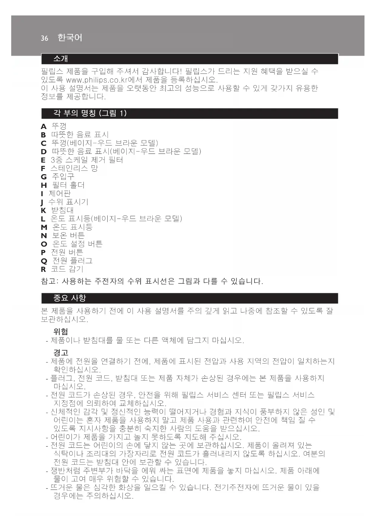 - 전원 코드가 손상된 경우, 안전을 위해 필립스 서비스 센터 또는 필립스 서비스 지정점에 의뢰하여 교체하십시오. - 신체적인 감각 및 정신적인 능력이 떨어지거나 경험과 지식이 풍부하지 않은 성인 및 어린이는 혼자 제품을 사용하지 말고 제품 사용과 관련하여 안전에 책임 질 수 있도록 지시사항을 충분히 숙지한 사람의 도움을 받으십시오. - 어린이가 제품을 가지고 놀지 못하도록 지도해 주십시오. - 전원 코드는 어린이의 손에 닿지 않는 곳에 보관하십시오. 제품이 올려져 있는 식탁이나 조리대의 가장자리로 전원 코드가 흘러내리지 않도록 하십시오. 여분의 전원 코드는 받침대 안에 보관할 수 있습니다. - 쟁반처럼 주변부가 바닥을 에워 싸는 표면에 제품을 놓지 마십시오. 제품 아래에 물이 고여 매우 위험할 수 있습니다. - 뜨거운 물은 심각한 화상을 일으킬 수 있습니다. 전기주전자에 뜨거운 물이 있을 경우에는 주의하십시오. 한국어- 물이 가열 중이거나 물을 사용한 직후에는 전기주전자가 매우 뜨거우므로 신체에 접촉하지 않도록 하십시오. 항상 손잡이 부분을 잡고 전기주전자를 들어올리십시오. - 전기주전자에 최대량 표시인 MAX 눈금 이상 물을 넣지 마십시오. 물을 너무 많이 넣을 경우, 끓는 물이 배출구 밖으로 넘쳐 화상을 입을 수 있습니다. - 물이 끓는 동안에는 뚜껑을 열지 마십시오. 물이 끓고 난 다음 바로 뚜껑을 열 경우, 전기주전자에서 나오는 수증기가 매우 뜨거우므로 주의하십시오. - 물을 신속히 끓일 수 있는 이 제품은 13A의 전력을 소모합니다. 사용 가정의 전기 시스템과 전원 차단기의 용량이 해당 전력 소비량 수준인지 확인하십시오. 전기주전자를 사용하실 때에는 같은 회선에 너무 많은 전기 기기를 동시에 작동하지