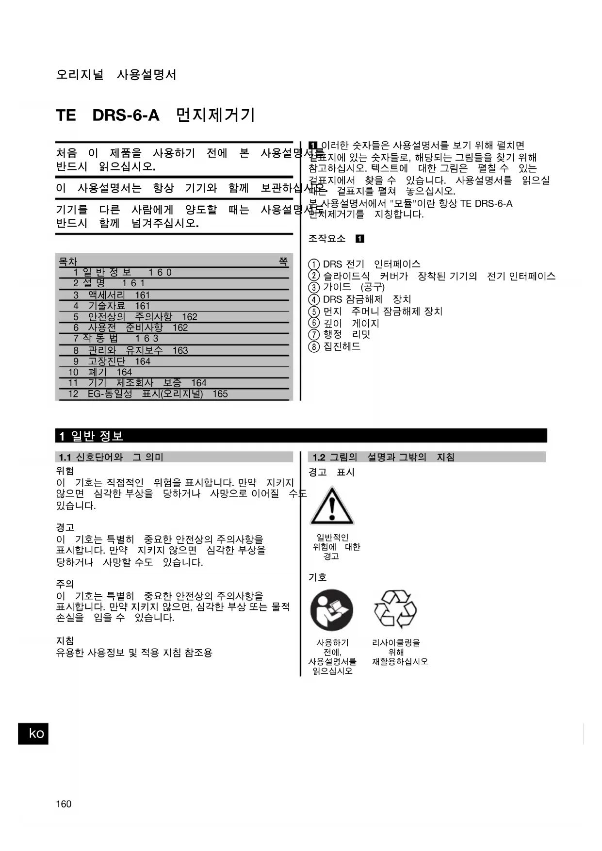 1일반정보 1602설명 1613 액세서리 1614 기술자け 1615 안전상의 주의사항 1626 사용전 준비사항 1627작동법 1638 관리와 유지보수 1639 고장진단 16410 폐기 16411 기기 제조회사 보증 16412 EG-동일성 표시(오리지널) 165 1 이러한 숫자들은 사용설명서를 보기 위해 펼치면 겉표지에 있는 숫자들로, 해당되는 그림들을 찾기 위해 참고하십시오. 텍스트에 대한 그림은 펼칠 수 있는겉표지에서 찾을 수 있습니다. 사용설명서를 읽으실때는 겉표지를 펼쳐 놓으십시오.