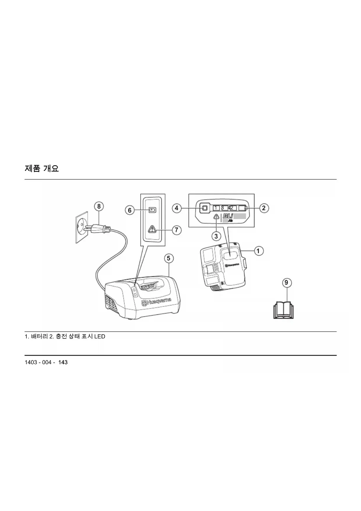 - 항상 Husqvarna BLi100, BLi200, BLi300, BLi200X, BLi550X 또는 BLi950X 배터리를 사용하십시오.