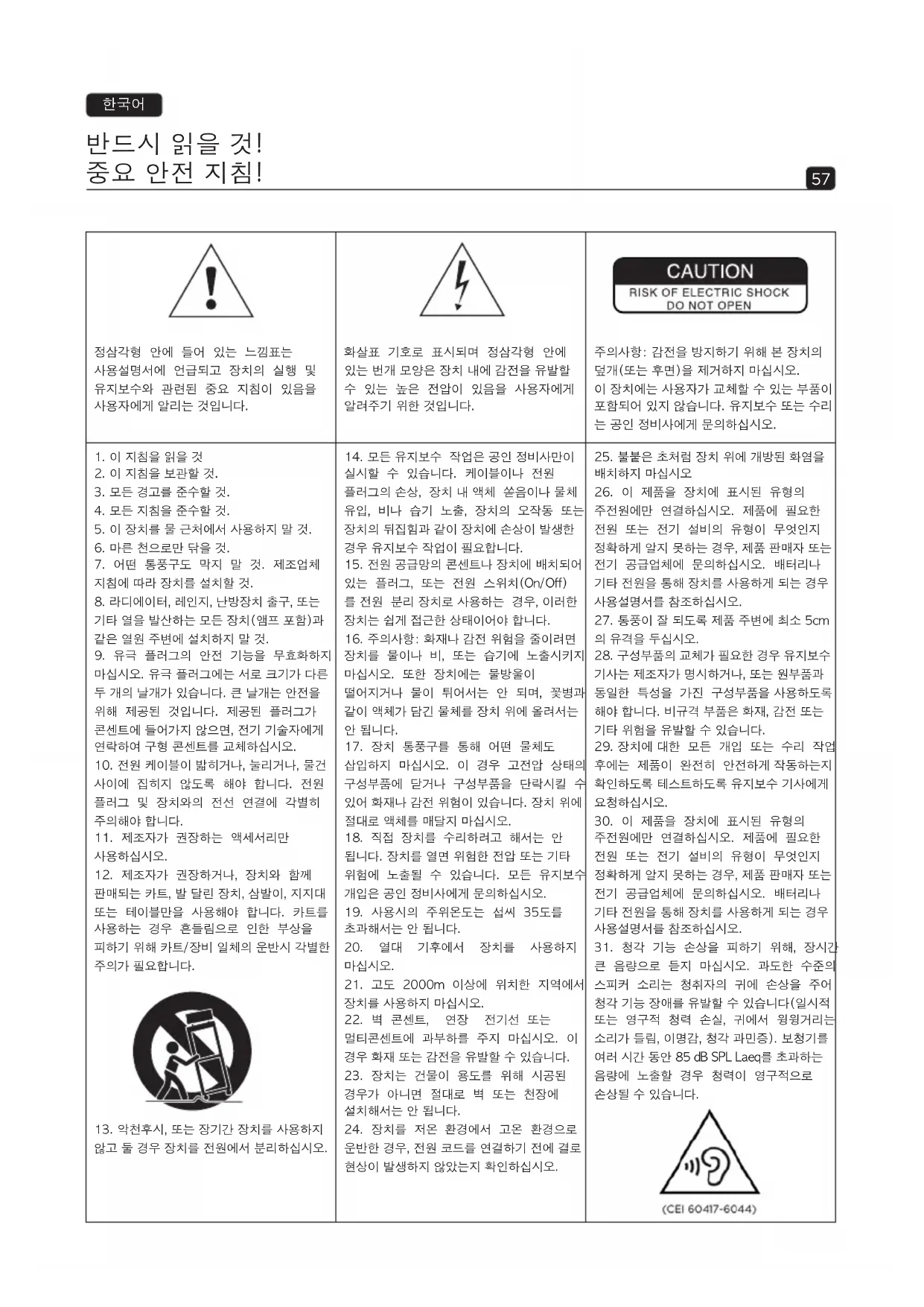 정삼각형 안에 들어 있는 느낌표는 사용설명서에 언급되고 장치의 실행 및 유지보수와 관련된 중요 지침이 있음을 사용자에게 알리는 것입니다. 화살표 기호로 표시되며 정삼각형 안에 있는 번개 모양은 장치 내에 감전을 유발할 수 있는 높은 전압이 있음을 사용자에게 알려주기 위한 것입니다. 주의사항: 감전을 방지하기 위해 본 장치의 덮개(또는 후면)을 제거하지 마십시오. 이 장치에는 사용자가 교체할 수 있는 부품이 포함되어 있지 않습니다. 유지보수 또는 수리 는 공인 정비사에게 문의하십시오.