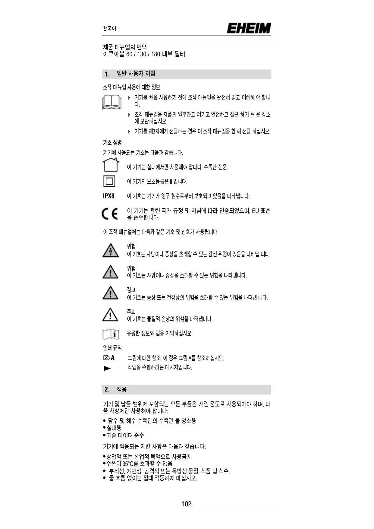 기기에 사용되는 기호는 다음과 같습니다. 이 기기는 실내에서만 사용해야 합니다. 수족관 전용. 이 기기의 보호등급은 II 입니다. IPX8 이 기호는 기기가 영구 침수로부터 보호되고 있음을 나타냅니다. 이 기기는 관련 국가 규정 및 지침에 따라 인증되었으며, EU 표준