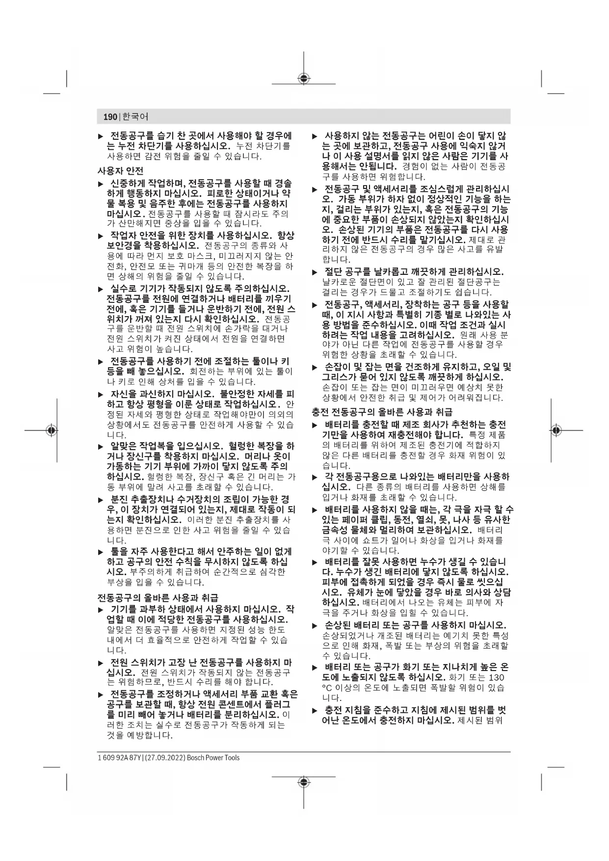 Bosch Power Tools 1 609 92A 87Y | (27.09.2022)190 | 한국어 u 전동공구를 습기 찬 곳에서 사용해야 할 경우에 는 누전 차단기를 사용하십시오. 누전 차단기를 사용하면 감전 위험을 줄일 수 있습니다.