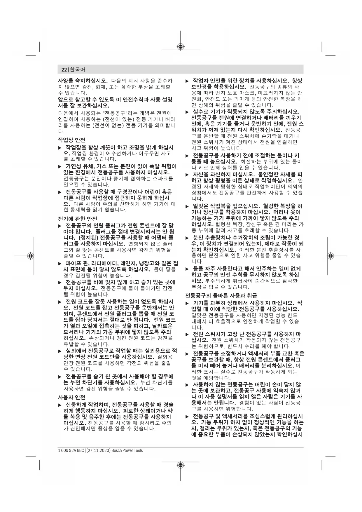 본 전동공구와 함께 제공된 모 든 안전경고, 지시사항, 그림 및 Bosch Power Tools 1 609 92A 68C | (27.11.2020)22 | 한국어 사양을 숙지하십시오. 다음의 지시 사항을 준수하 지 않으면 감전, 화재, 또는 심각한 부상을 초래할