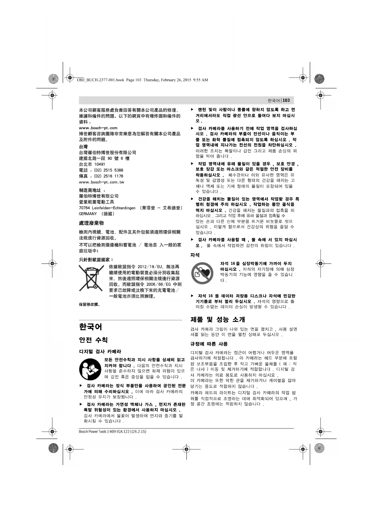 Bosch-pt.hotline@kr.bosch.com Bosch Korea, RBKR Mechanics and Electronics Ltd. PT/SAX-ASA 298 Bojeong-dong Giheung-gu Yongin-si, Gyeonggi-do, 446-913 Republic of Korea 080-955-0909 OBJ_BUCH-2377-001.book Page 105 Thursday, February 26, 2015 9:55 AM106 | 1 609 92A 122 | (26.2.15) Bosch Power Tools 검사 카메라 , 배터리 , 부속품 및 포장은 재활용을 위해 분리배출합니다 .검사 카메라와 충전용 배터리 / 배터리들은 가정의 쓰레기통에 버리지 마십시오 .EU 국가만 해당 :더이상 사용할 수 없는 전동 기기 및 결함이 있거나 사용한 충전용 배터리 / 배터리는 유럽 가이드라인 2012/19/EU 및 유럽 가이드라인 2006/66/EG 에 따라 분리 수거하여 환경 규정에 맞춰 재활용해야 합니다 .위 사항은 사전 예고 없이 변경될 수도 있습니다 .