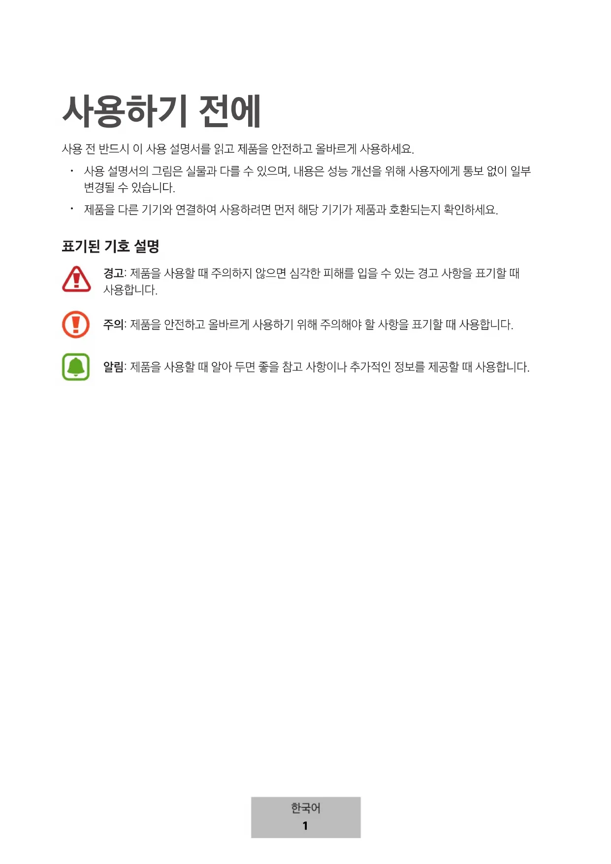 주의: 제품을 안전하고 올바르게 사용하기 위해 주의해야 할 사항을 표기할 때 사용합니다. 알림: 제품을 사용할 때 알아 두면 좋을 참고 사항이나 추가적인 정보를 제공할 때 사용합니다.