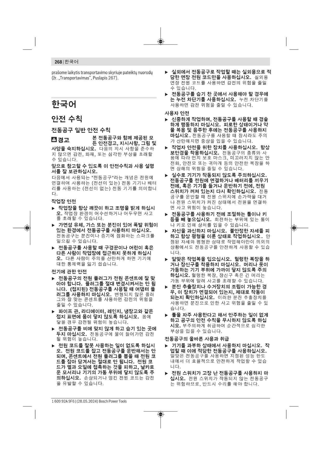 u 전원 스위치가 고장 난 전동공구를 사용하지 마 십시오. 전원 스위치가 작동되지 않는 전동공구 는 위험하므로, 반드시 수리를 해야 합니다. 1 609 92A 9F6 | (28.05.2024) Bosch Power Tools한국어 | 269 u 전동공구를 조정하거나 액세서리 부품 교환 혹은 공구를 보관할 때, 항상 전원 콘센트에서 플러그 를 미리 빼어 놓거나 배터리를 분리하십시오. 이 러한 조치는 실수로 전동공구가 작동하게 되는