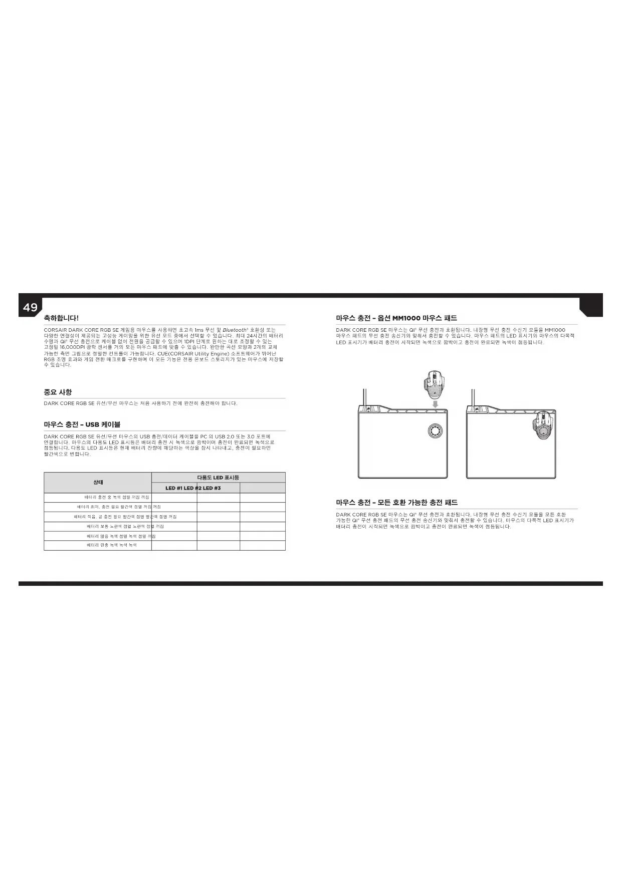 スナイパーモード交戦中 黄 黄 黄 スナイパーモード非交戦中 デフォルト デフォルト デフォルト49 50 DARK CORE RGB SE 마우스는 Qi® 무선 충전과 호환됩니다. 내장형 무선 충전 수신기 모듈을 모든 호환 가능한 Qi® 무선 충전 패드의 무선 충전 송신기와 맞춰서 충전할 수 있습니다. 마우스의 다목적 LED 표시기가 배터리 충전이 시작되면 녹색으로 깜박이고 충전이 완료되면 녹색이 점등됩니다. DARK CORE RGB SE 마우스는 Qi® 무선 충전과 호환됩니다. 내장형 무선 충전 수신기 모듈을 MM1000 마우스 패드의 무선 충전 송신기와 맞춰서 충전할 수 있습니다. 마우스 패드의 LED 표시기와 마우스의 다목적 LED 표시기가 배터리 충전이 시작되면 녹색으로 깜박이고 충전이 완료되면 녹색이 점등됩니다. 마우스 충전 – 모든 호환 가능한 충전 패드 마우스 충전 – 옵션 MM1000 마우스 패드 DARK CORE RGB SE 유선/무선 마우스의 USB 충전/데이터 케이블을 PC 의 USB 2.0 또는 3.0 포트에 연결합니다. 마우스의 다용도 LED 표시등은 배터리 충전 시 녹색으로 깜박이며 충전이 완료되면 녹색으로 점등됩니다. 다용도 LED 표시등은 현재 배터리 잔량에 해당하는 색상을 잠시 나타내고, 충전이 필요하면 빨간색으로 변합니다. 마우스 충전 – USB 케이블 DARK CORE RGB SE 유선/무선 마우스는 처음 사용하기 전에 완전히 충전해야 합니다.