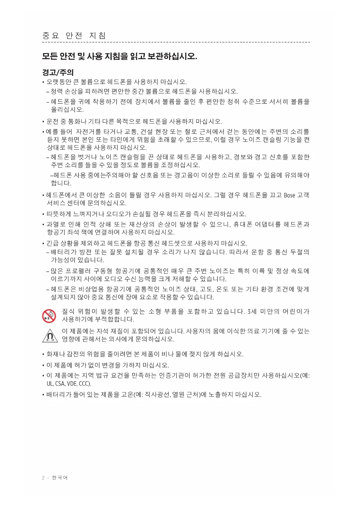 들릴 경우 사용하지 마십시오. 그럴 경우 헤드폰을 끄고 Bose 고객 서비스 센터에 문의하십시오.