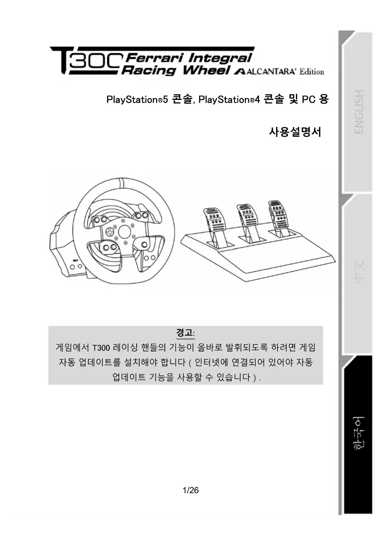 게임에서 T300 레이싱 핸들의 기능이 올바로 발휘되도록 하려면 게임 자동 업데이트를 설치해야 합니다(인터넷에 연결되어 있어야 자동 업데이트 기능을 사용할 수 있습니다).2/26