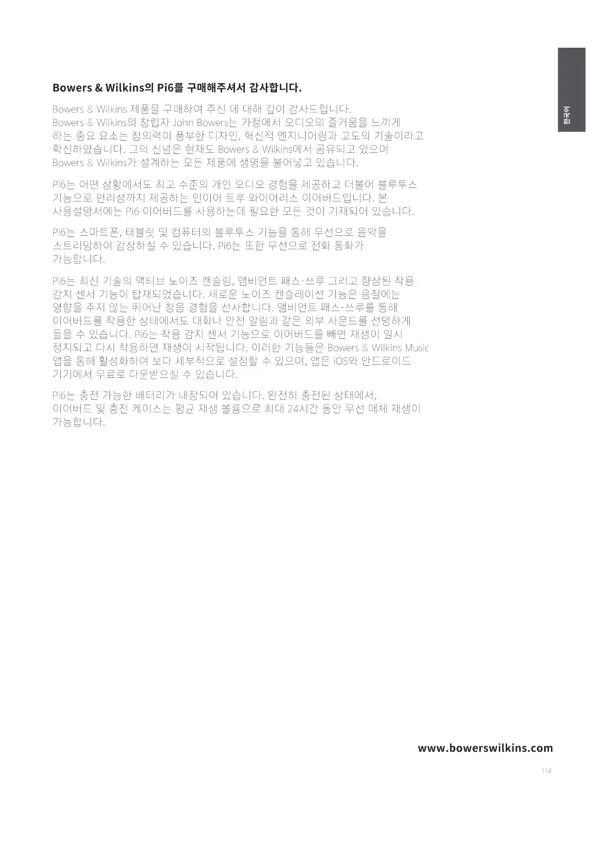 Bowers & Wilkins 제품을 구매하여 주신 데 대해 깊이 감사드립니다. Bowers & Wilkins의 창립자 John Bowers는 가정에서 오디오의 즐거움을 느끼게 하는 중요 요소는 창의력이 풍부한 디자인, 혁신적 엔지니어링과 고도의 기술이라고 확신하였습니다. 그의 신념은 현재도 Bowers & Wilkins에서 공유되고 있으며 Bowers & Wilkins가 설계하는 모든 제품에 생명을 불어넣고 있습니다. Pi6는 어떤 상황에서도 최고 수준의 개인 오디오 경험을 제공하고 더불어 블루투스 기능으로 편리성까지 제공하는 인이어 트루 와이어리스 이어버드입니다. 본 사용설명서에는 Pi6 이어버드를 사용하는데 필요한 모든 것이 기재되어 있습니다. Pi6는 스마트폰, 태블릿 및 컴퓨터의 블루투스 기능을 통해 무선으로 음악을 스트리밍하여 감상하실 수 있습니다. Pi6는 또한 무선으로 전화 통화가