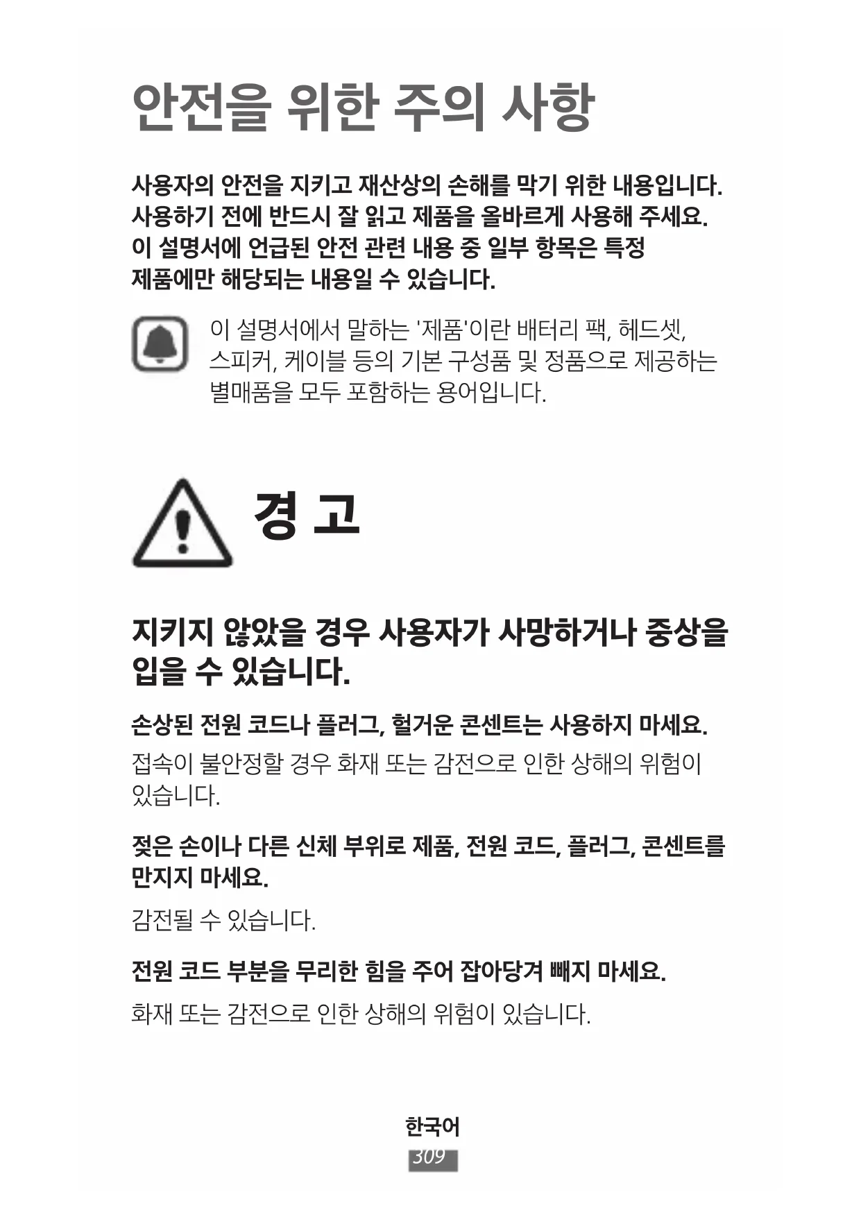 안전을 위한 주의 사항 사용자의 안전을 지키고 재산상의 손해를 막기 위한 내용입니다. 사용하기 전에 반드시 잘 읽고 제품을 올바르게 사용해 주세요. 이 설명서에 언급된 안전 관련 내용 중 일부 항목은 특정 제품에만 해당되는 내용일 수 있습니다. 이 설명서에서 말하는 '제품'이란 배터리 팩, 헤드셋, 스피커, 케이블 등의 기본 구성품 및 정품으로 제공하는 별매품을 모두 포함하는 용어입니다.