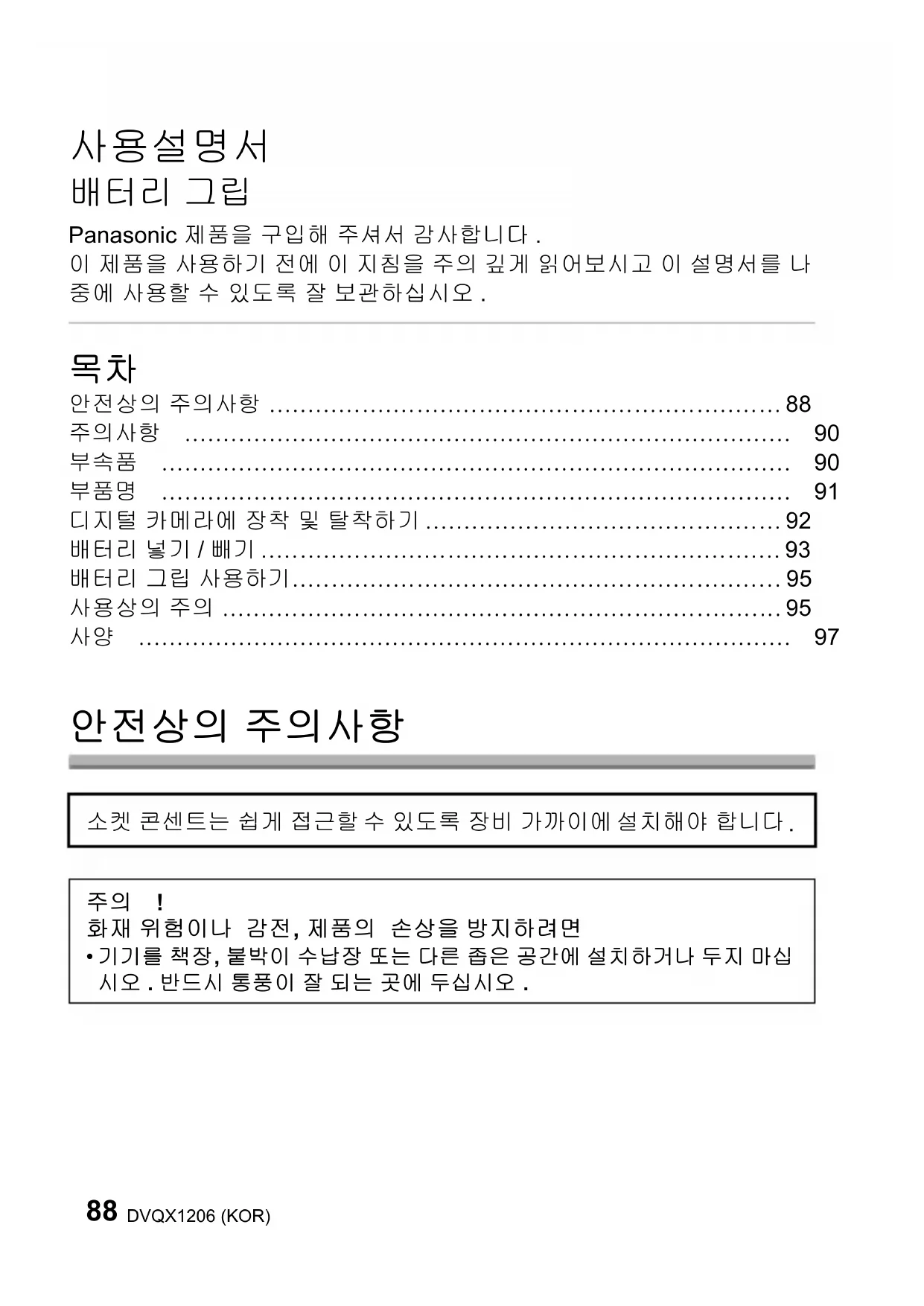 - 기기를 책장, 붙박이 수납장 또는 다른 좁은 공간에 설치하거나 두지 마십 시오 . 반드시 통풍이 잘 되는 곳에 두십시오 . DVQX1206.book 88 ページ 2017年2月6日 月曜日 午後5時29分89 (KOR) DVQX1206 ∫ 배터리 팩에 관해