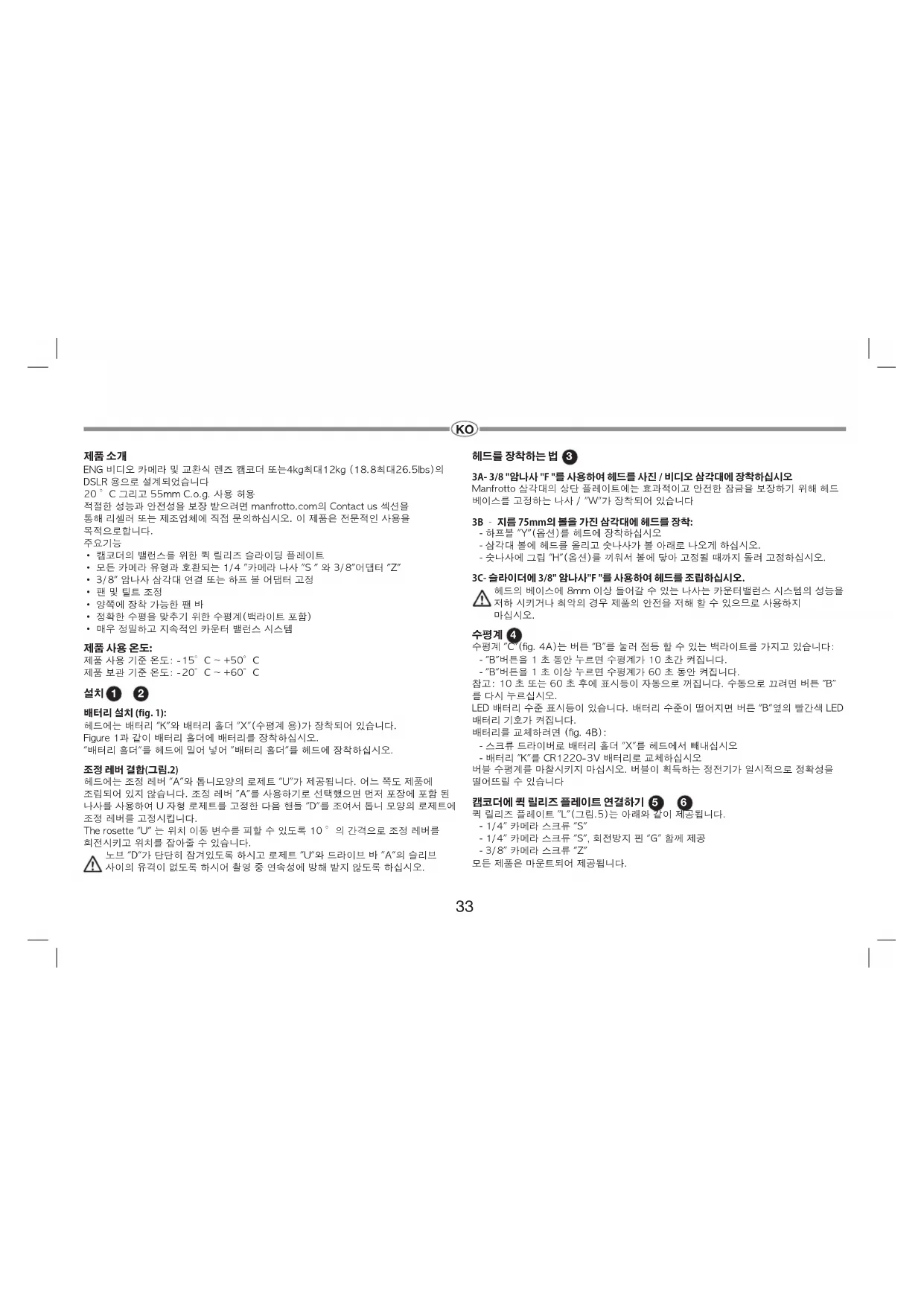 ENG 비디오 카메라 및 교환식 렌즈 캠코더 또는4kg최대12kg (18.8최대26.5lbs)의 DSLR 용으로 설계되었습니다 20 °C 그리고 55mm C.o.g. 사용 허용 적절한 성능과 안전성을 보장 받으려면 manfrotto.com의 Contact us 섹션을 통해 리셀러 또는 제조업체에 직접 문의하십시오. 이 제품은 전문적인 사용을