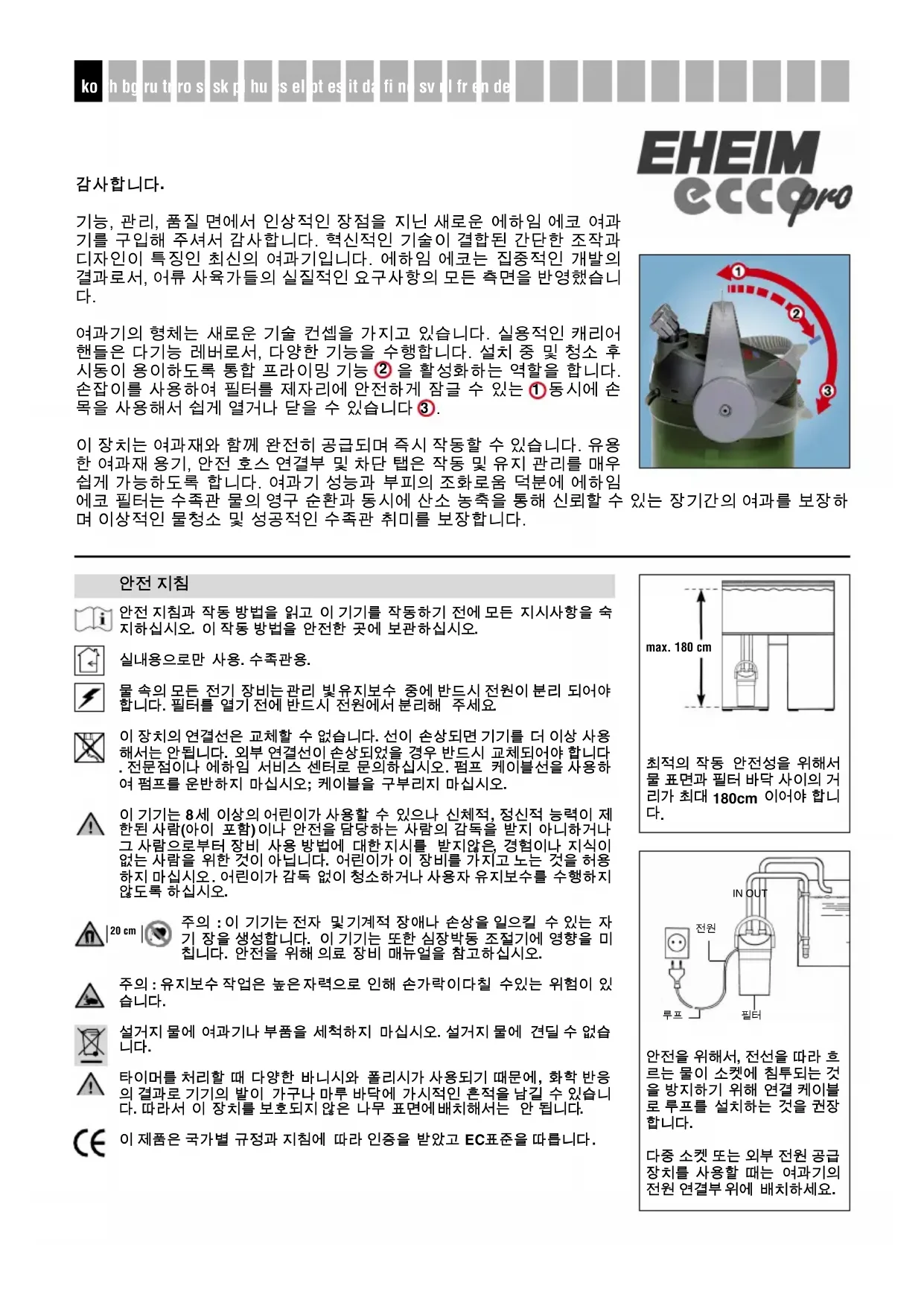 기능, 관리, 품질 면에서 인상적인 장점을 지닌 새로운 에하임 에코 여과 기를 구입해 주셔서 감사합니다. 혁신적인 기술이 결합된 간단한 조작과 디자인이 특징인 최신의 여과기입니다. 에하임 에코는 집중적인 개발의 결과로서, 어류 사육가들의 실질적인 요구사항의 모든 측면을 반영했습니