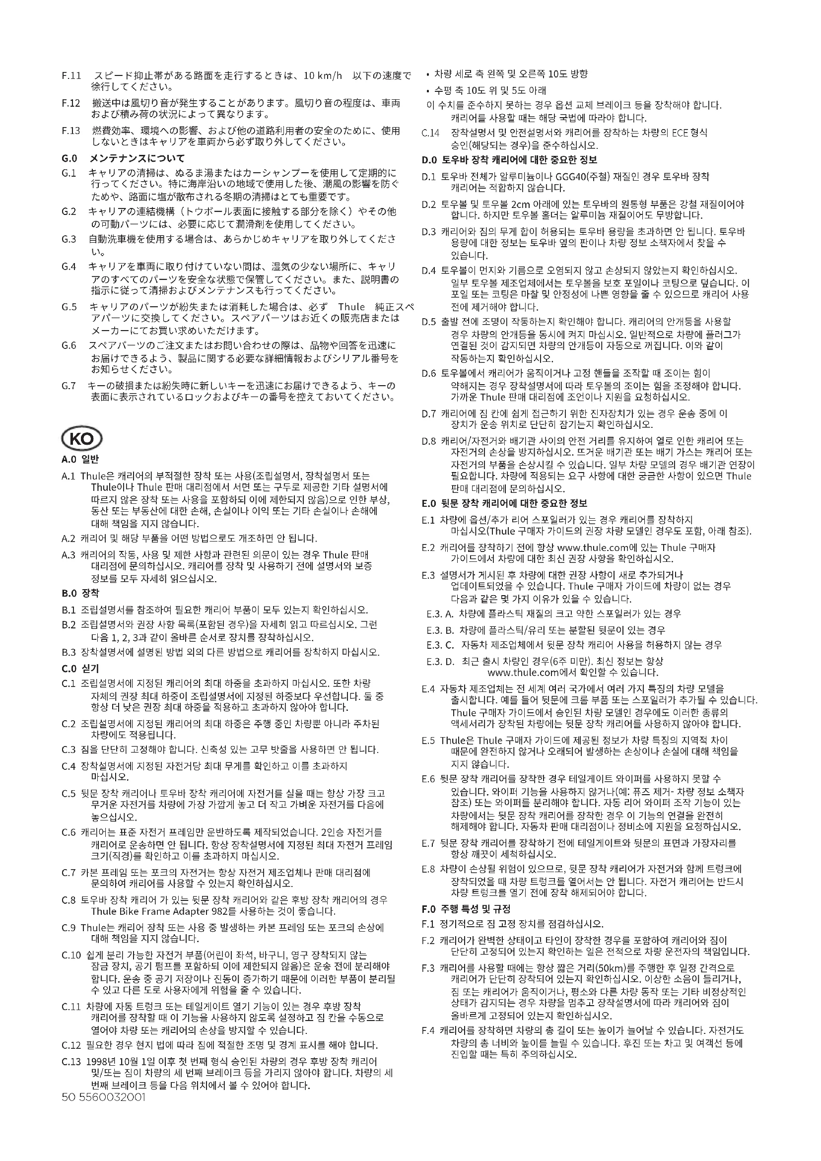 A.0 일반 A.1 Thule은 캐리어의 부적절한 장착 또는 사용(조립설명서, 장착설명서 또는 Thule이나 Thule 판매 대리점에서 서면 또는 구두로 제공한 기타 설명서에 따르지 않은 장착 또는 사용을 포함하되 이에 제한되지 않음)으로 인한 부상, 동산 또는 부동산에 대한 손해, 손실이나 이익 또는 기타 손실이나 손해에 대해 책임을 지지 않습니다. A.2 캐리어 및 해당 부품을 어떤 방법으로도 개조하면 안 됩니다. A.3 캐리어의 작동, 사용 및 제한 사항과 관련된 의문이 있는 경우 Thule 판매 대리점에 문의하십시오. 캐리어를 장착 및 사용하기 전에 설명서와 보증 정보를 모두 자세히 읽으십시오. B.0 장착 B.1 조립설명서를 참조하여 필요한 캐리어 부품이 모두 있는지 확인하십시오. B.2 조립설명서와 권장 사항 목록(포함된 경우)을 자세히 읽고 따르십시오. 그런 다음 1, 2, 3과 같이 올바른 순서로 장치를 장착하십시오. B.3 장착설명서에 설명된 방법 외의 다른 방법으로 캐리어를 장착하지 마십시오. C.0 싣기 C.1 조립설명서에 지정된 캐리어의 최대 하중을 초과하지 마십시오. 또한 차량 자체의 권장 최대 하중이 조립설명서에 지정된 하중보다 우선합니다. 둘 중 항상 더 낮은 권장 최대 하중을 적용하고 초과하지 않아야 합니다. C.2 조립설명서에 지정된 캐리어의 최대 하중은 주행 중인 차량뿐 아니라 주차된 차량에도 적용됩니다. C.3 짐을 단단히 고정해야 합니다. 신축성 있는 고무 밧줄을 사용하면 안 됩니다. C.4 장착설명서에 지정된 자전거당 최대 무게를 확인하고 이를 초과하지
