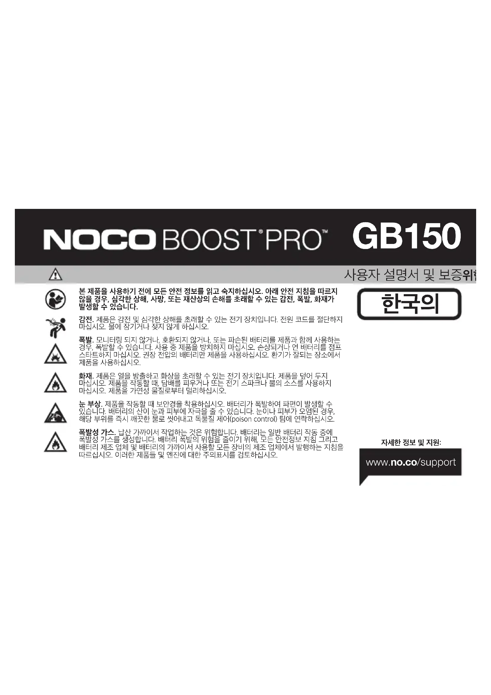 www.no.co/support개인 주의사항. 의도한 용도로만 제품을 사용합니다. 만일의 경우에 대비하여, 작동자의 음성을 들을 수 있을 정도의 범위 내 또는 도움을 줄 수 있는 거리에 누군가가 있어야 합니다. 배터리 산 오염의 경우에 대비하여, 가까이에 깨끗한 물과 비누가 준비되어 있어야 합니다. 배터리 근처에서 작업하는 동안, 눈을 완전히 보호할 수 있는 보안경 및 보호복을 착용하십시오. 배터리 및 관련 물질을 취급한 후에는 항상 손을 씻으십시오. 배터리로 작업할 때, 도구, 시계나 보석 등의 금속물질을 처리하거나 착용하지 마십시오. 금속이 배터리에 떨어질 경우, 상해, 사망 또는 재산상의 손해를 초래할 수 있는 전기 충격이나 합선이 발생할 수 있습니다. 미성년자. "구매자"가 제품을 미성년자가 사용할 의도로 구입하는 경우, 제품을 구입하는 성인은 해당 미성년자가 사용하기 전에 자세한 지침과 경고를 제공하는 데 동의함을 의미합니다. 이를 이행하지 않은 경우, 미성년자에 의한 의도하지 않은 사용이나 오용에 대해 NOCO에게 책임을 물지 않겠다고 동의한 "구매자"의 전적인 책임입니다. 질식 위험. 부품들은 아이들에게 질식의 위험이 있습니다. 어린이를 제품 또는 액세서리와 남겨둔 채 방치하지 마십시오. 제품은 장난감이 아닙니다. 취급. 제품을 주의해서 취급하십시오. 충격을 받을 경우 제품이 손상될 수 있습니다. 케이스에 균열이나 손상 케이블을 포함하여, 하지만 이에 국한되지 않고, 손상된 제품을 사용하지 마십시오. 손상된 전원 코드로 제품을 사용하지 마십시오. 습도 및 액체가 제품을 손상할 수 있습니다. 제품이나 전기부품을 액체 가까이에서 처리하지 마십시오. 건조한 장소에서 제품을 보관하고 작동하십시오. 젖은 경우 제품을 사용하지 마십시오. 작동 중 충전 기가 젖었을 경우, 전기 콘센트와 배터리로부터 분리하고 즉시 사용을 중지하십시오. 케이블을 당겨서 제품을 분리하지 마십시오. 수정. 제품의 어느 부분도 변경, 수정 또는 수리하려고 하지 마십시오. 제품 분해는 상해, 사망 또는 재산상의 손해를 초래할 수 있습니다. 제품의 손상, 오작동 또는 액체와 접촉한 경우, 사용을 중지하고 NOCO에 문의하십시오. 제품을 수정한 경우 보증은 무효화됩니다. 부속품. 이 제품은 NOCO 부품과 함께 사용할 경우에 한하여 사용이 승인되었습니다. NOCO가 승인하지 않은 부품을 사용할 경우, NOCO는 사용자의 안전이나 손해에 대해 책임을 지지 않습니다. 위치. 배터리의 산이 제품에 접촉하지 않도록 하십시오. 밀폐된 장소 또는 환기가 제한된 곳에서 제품을 사용하지 마십시오. 제품 위에