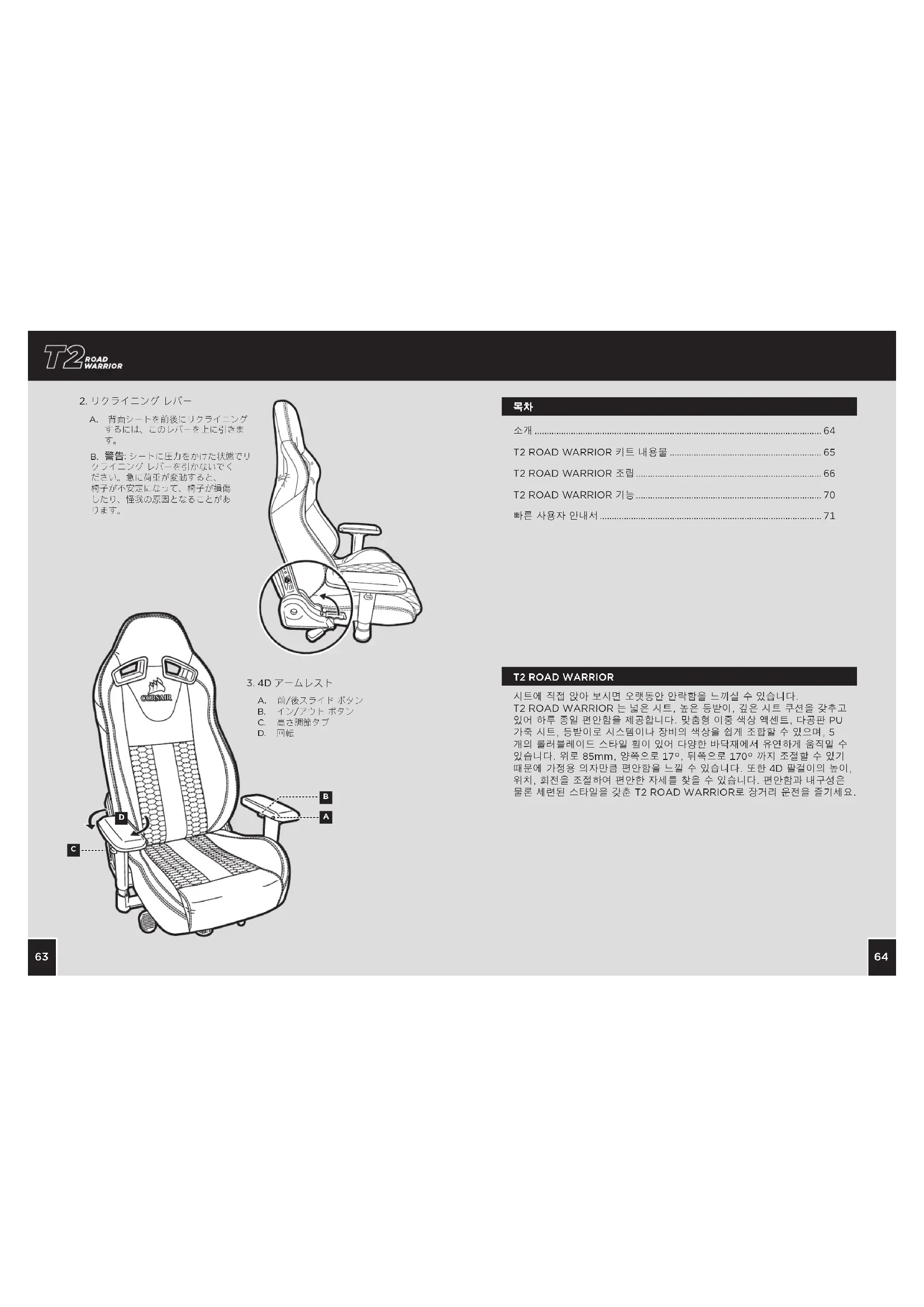 소개 ....................................................................................................................... TROADWARRIOR키트 내용물 ............................................................... TROADWARRIOR조립 ............................................................................. TROADWARRIOR기능 ............................................................................. 빠른 사용자 안내서 ............................................................................................ 시트에 직접 앉아 보시면 오랫동안 안락함을 느끼실 수 있습니다. TROADWARRIOR는 넓은 시트, 높은 등받이, 깊은 시트 쿠션을 갖추고 있어 하루 종일 편안함을 제공합니다. 맞춤형 이중 색상 액센트, 다공판 PU 가죽 시트, 등받이로 시스템이나 장비의 색상을 쉽게 조합할 수 있으며, 개의 롤러블레이드 스타일 휠이 있어 다양한 바닥재에서 유연하게 움직일 수 있습니다. 위로 mm, 양쪽으로, 뒤쪽으로 까지 조절할 수 있기 때문에 가정용 의자만큼 편안함을 느낄 수 있습니다. 또한 D 팔걸이의 높이, 위치, 회전을 조절하여 편안한 자세를 찾을 수 있습니다. 편안함과 내구성은 물론 세련된 스타일을 갖춘 TROADWARRIOR로 장거리 운전을 즐기세요.