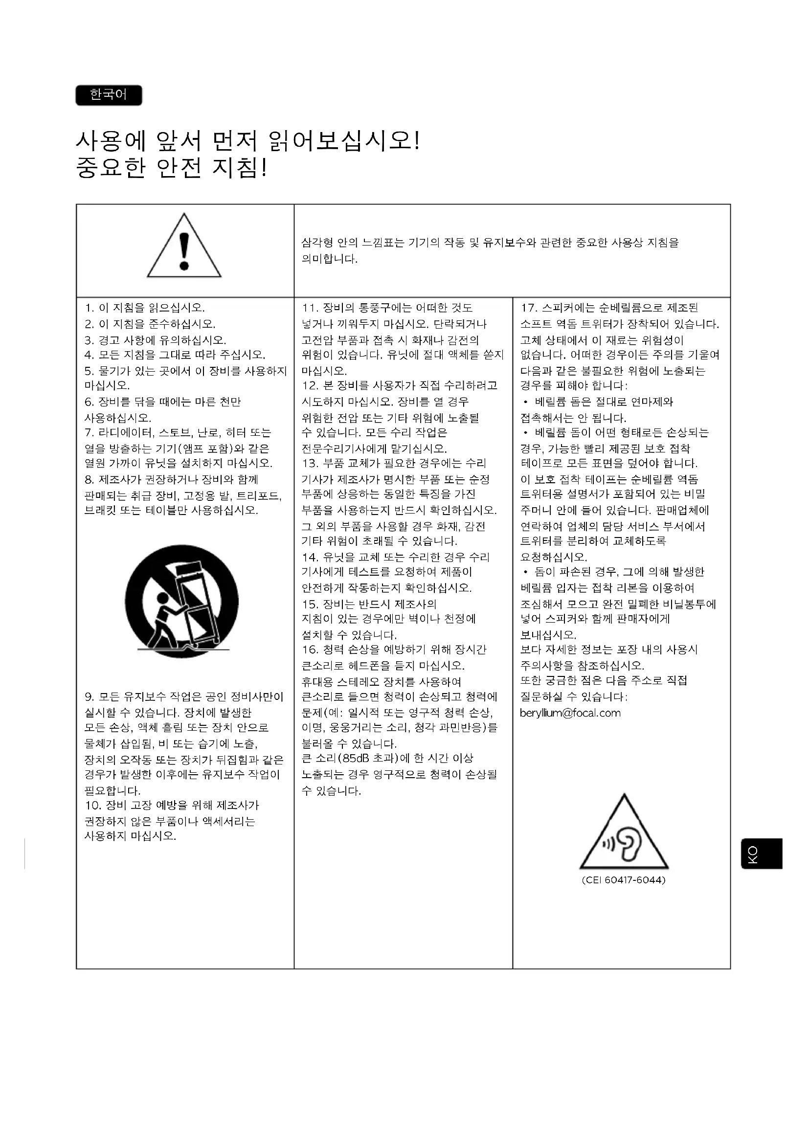 보다 자세한 정보는 포장 내의 사용시 주의사항을 참조하십시오. 또한 궁금한 점은 다음 주소로 직접 질문하실 수 있습니다: beryllium@focal.com (CEI 60417-6044)54 SOPRA