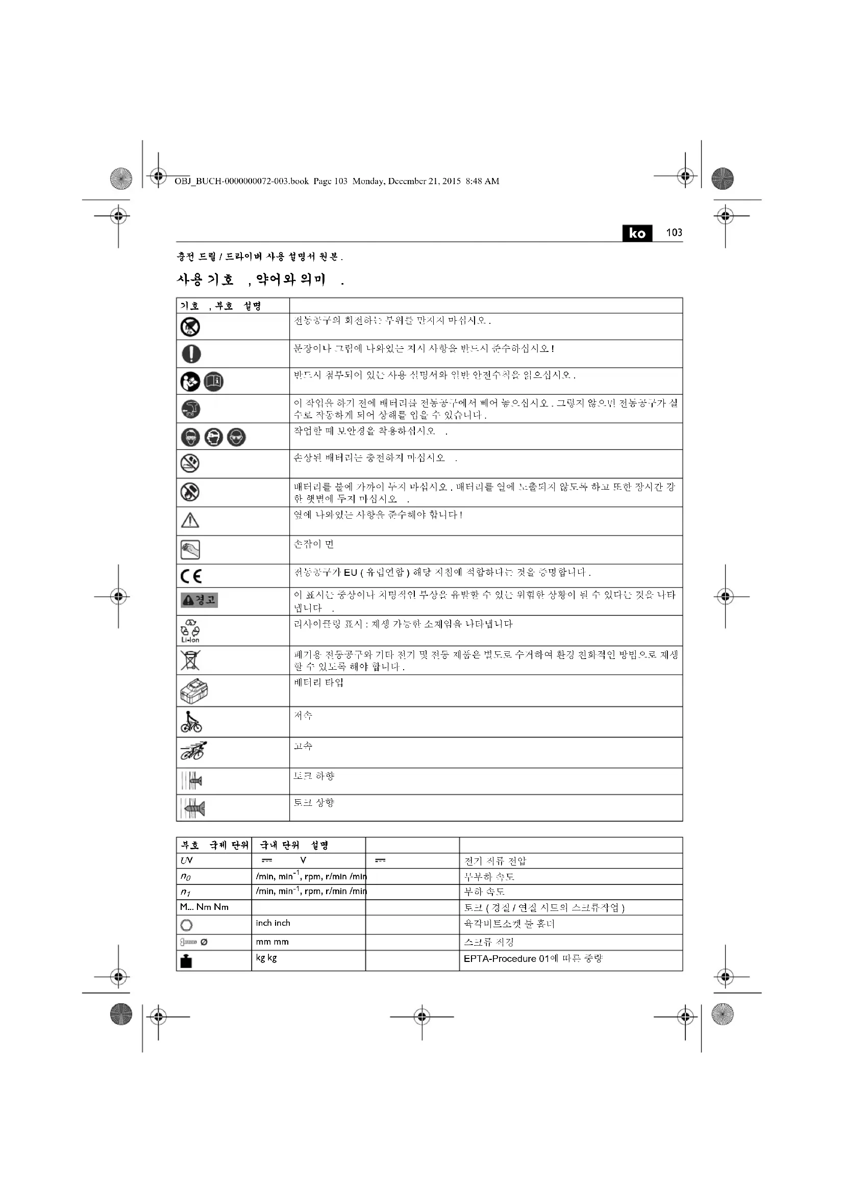 리사이클링 표시 : 재생 가능한 소재임을 나타냅니다 폐기용 전동공구와 기타 전기 및 전동 제품은 별도로 수거하 여 환경 친화적인 방법으로 재생 할 수 있도록 해야 합니다 .