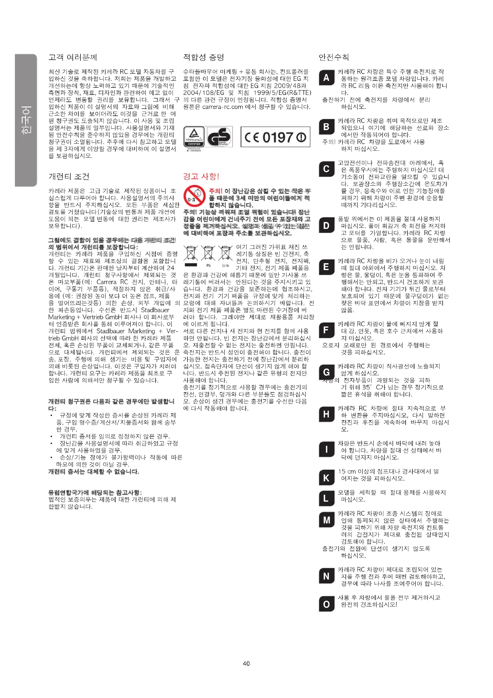 그럼에도 결함이 있을 경우에는 다음 개런티 조건 의 범위에서 개런티를 보장합니다: 개런티는 카레라 제품을 구입하신 시점에 증명 할 수 있는 재료와 제조상의 결함을 포함합니 다. 개런티 기간은 판매한 날자부터 계산하여 24 개월입니다. 개런티 청구사항에서 제외되는 것 은 마모부품(예: Carrera RC 전지, 안테나, 타 이어, 구동기 부품등), 적절하지 않은 취급/사 용에 (예: 권장된 높이 보다 더 높은 점프, 제품 을 떨어뜨리는것등) 의한 손상, 외부 개입에 의 한 파손등입니다. 수선은 반드시 Stadlbauer Marketing + Vertrieb GmbH 회사나 이 회사로부 터 인증받은 회사를 통해 이루어져야 합니다. 이 개런티 범위에서 Stadlbauer Marketing + Ver- trieb GmbH 회사의 선택에 따라 한 카레라 제품 전체, 혹은 손상된 부품이 교체되거나, 같은 부품 으로 대체됩니다. 개런티에서 제외되는 것은 운 송, 포장, 주행에 의해 생기는 비용 및 구입자에 의해 비롯된 손상입니다. 이것은 구입자가 치러야 합니다. 개런티 요구는 카레라 제품을 최초로 구 입한 사람에 의해서만 청구될 수 있습니다. 개런티 청구권은 다음과 같은 경우에만 발생합니