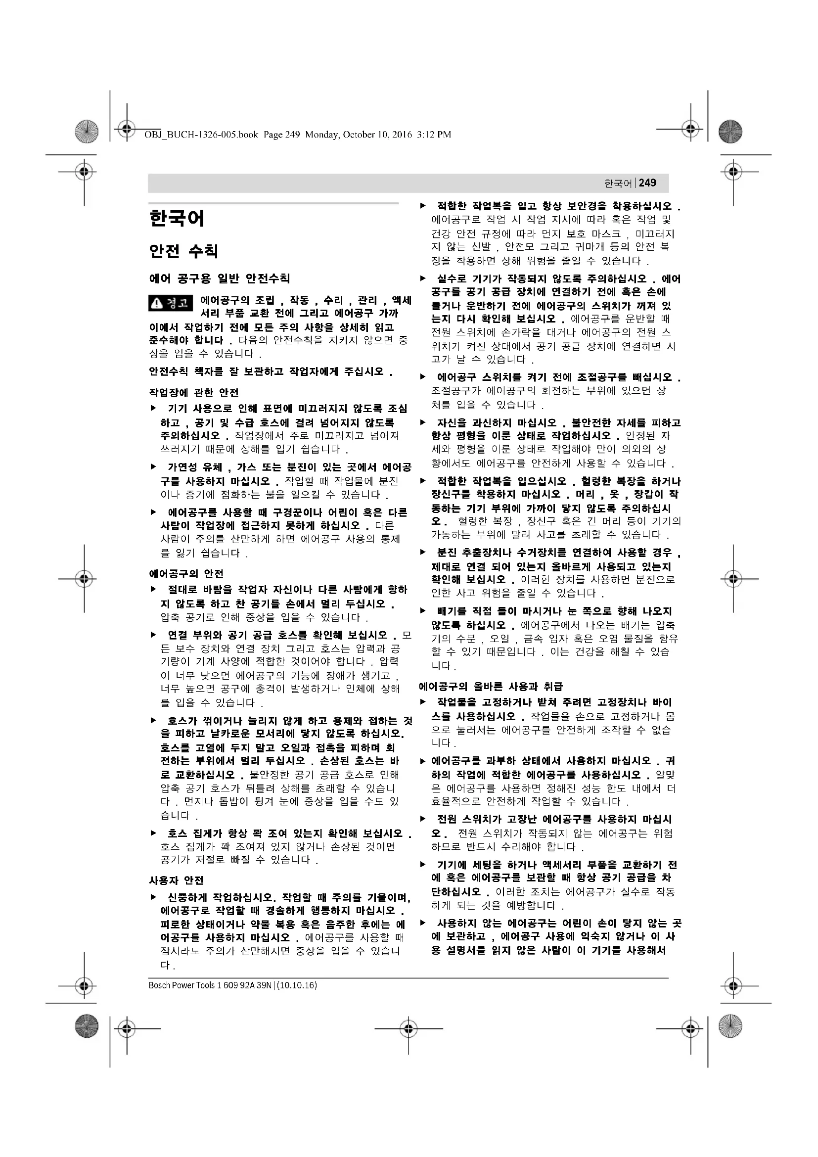 – 납 성분이 있는 페인트와 도료에 들어 있는 납 ; – 벽돌 , 시멘트 그리고 기타 조적작업 소재에 들어 있는 크리스탈린 실리카 ; – 화학 공정을 거친 목재에 들어 있는 비소와 크롬 . 질병의 위험도는 얼마나 자주 이러한 소재에 작업하느 냐에 따라 좌우됩니다 . 이러한 위험을 줄이려면 항상 통풍이 잘되는 공간에서 적합한 안전 장치를 사용하여 작업해야 합니다 ( 예를 들어 미소한 분진 분자까지도 걸러지는 특수하게 설계된 호흡 마스크 사용 ). 특정 자재들은 폭발가능성이 있는 기체와 먼지를 발 생시킬 수 있습니다 . 압축공구를 사용한 작업으로 불꽃이 발생하여 먼지나 기체에 점화될 수 있습니다 . OBJ_BUCH-1326-005.book Page 250 Monday, October 10, 2016 3:12 PM한국어 | 251 Bosch Power Tools 1 609 92A 39N | (10.10.16) 작업물에 작업 시 추가적인 소음 공해가 생길 수 있 습니다 . 작업물에서 울리는 소리가 나면 방음재 등 적합한 조치를 하여 예방할 수 있습니다 . 에어공구에 머플러가 있는 경우 , 에어공구 작동 시 항상 사용이 가능하고 좋은 상태를 유지하도록 해야