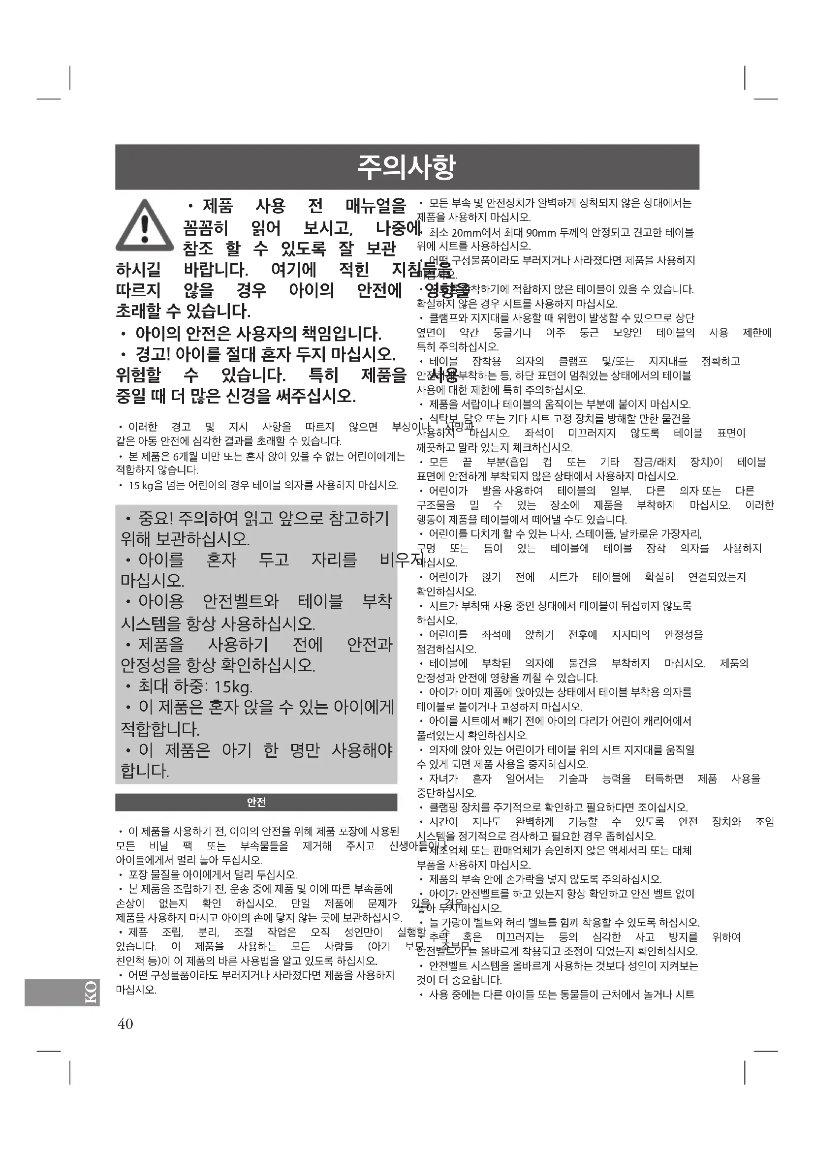 - 아이용 안전벨트와 테이블 부착 시스템을항상사용하십시오.