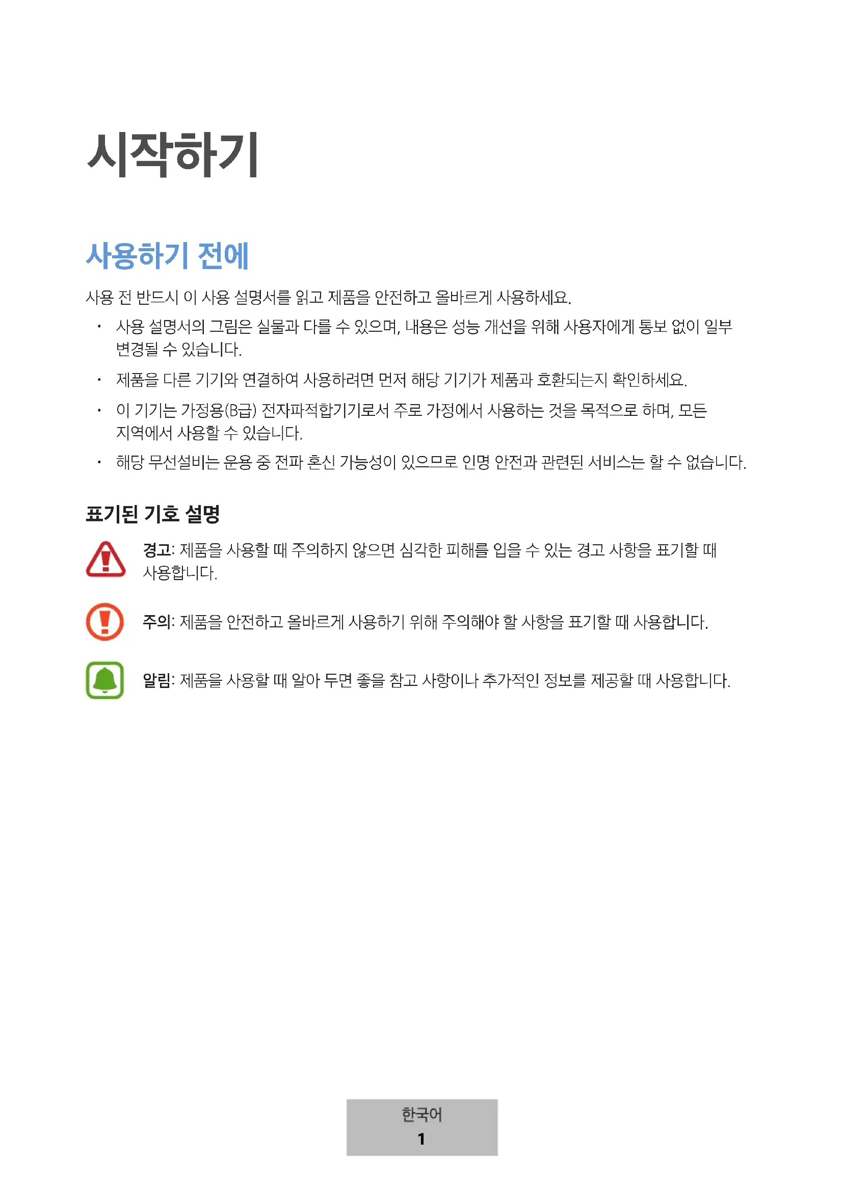 사용 전 반드시 이 사용 설명서를 읽고 제품을 안전하고 올바르게 사용하세요. 사용 설명서의 그림은 실물과 다를 수 있으며, 내용은 성능 개선을 위해 사용자에게 통보 없이 일부 변경될 수 있습니다. 제품을 다른 기기와 연결하여 사용하려면 먼저 해당 기기가 제품과 호환되는지 확인하세요. 이 기기는 가정용(B급) 전자파적합기기로서 주로 가정에서 사용하는 것을 목적으로 하며, 모든 지역에서 사용할 수 있습니다. 해당 무선설비는 운용 중 전파 혼신 가능성이 있으므로 인명 안전과 관련된 서비스는 할 수 없습니다. 경고: 제품을 사용할 때 주의하지 않으면 심각한 피해를 입을 수 있는 경고 사항을 표기할 때 사용합니다.주의: 제품을 안전하고 올바르게 사용하기 위해 주의해야 할 사항을 표기할 때 사용합니다.알림: 제품을 사용할 때 알아 두면 좋을 참고 사항이나 추가적인 정보를 제공할 때 사용합니다.