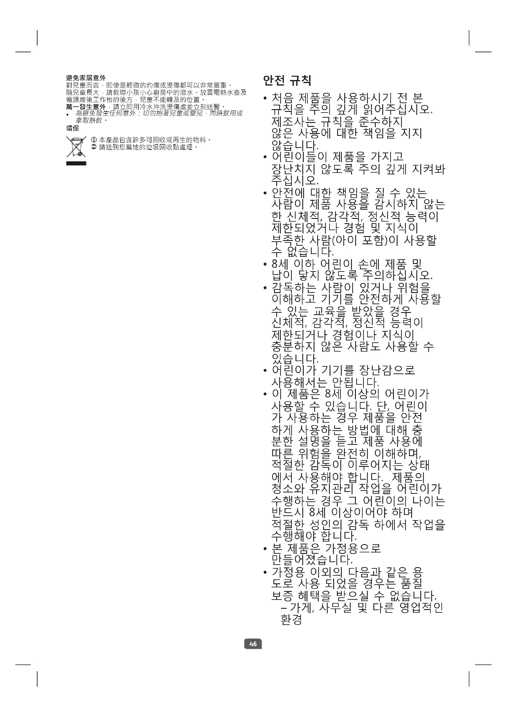 - 이 보증은 제조 시 결함과 가정 내 사용에만 적용됩니다. 사용 설명서를 준수하지 않음으로 인해 발생한 파손이나 손상에는 보증이 일체 적용되지 않습니다. 처음으로 사용하기 전에