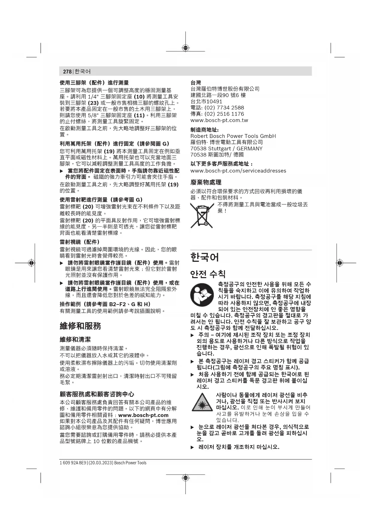 1 609 92A 8E9 | (20.03.2023) Bosch Power Tools한국어 | 283 작동하는 동안 흔들리거나 위치가 변경되는 경우 측 정공구는 자동으로 다시 레벨링됩니다. 레벨링이 끝 나면 측정공구가 움직여져 발생하는 에러를 방지하 기 위해 레이저빔이 기준 레벨에 맞는지 그 위치를