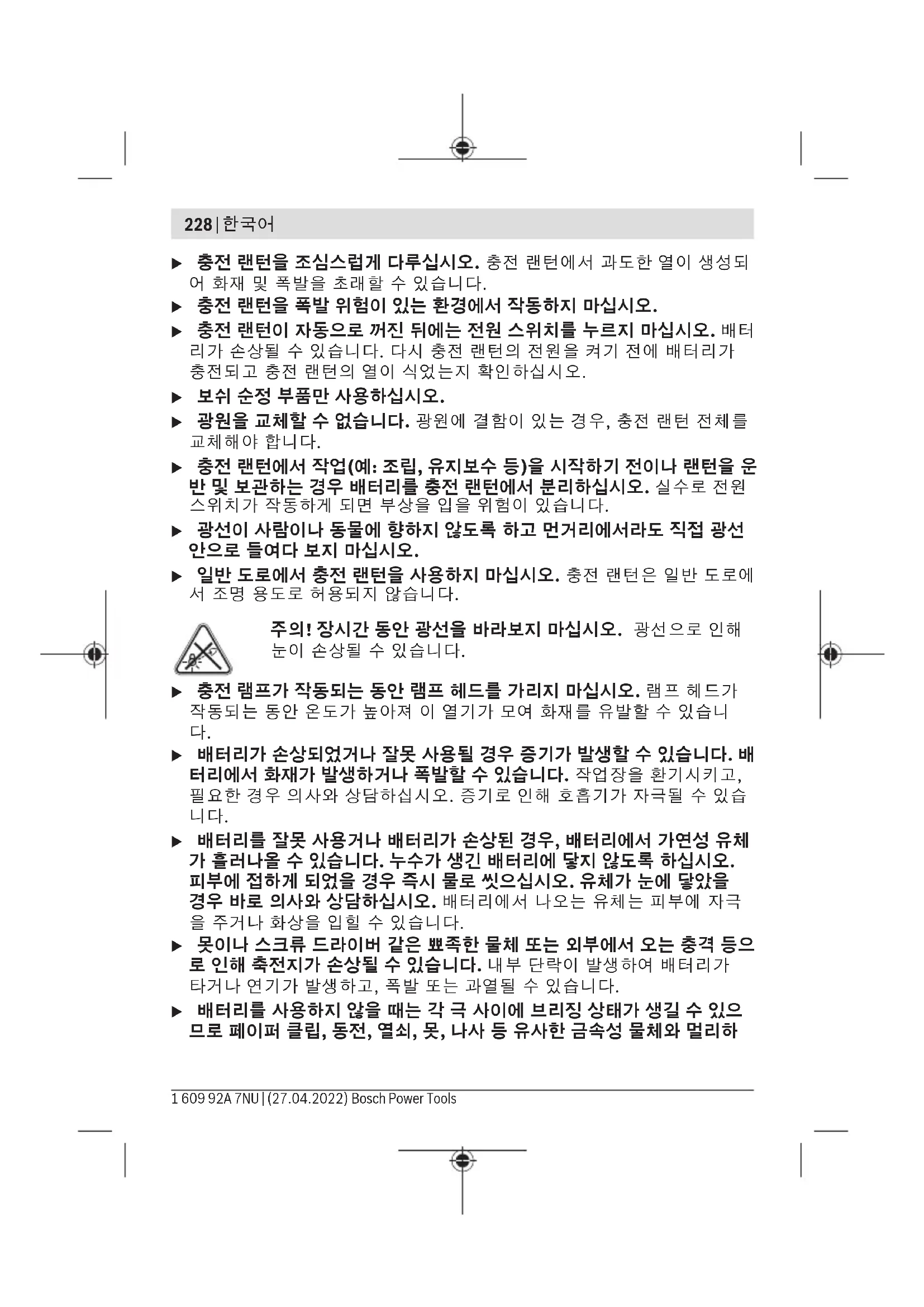 충전 랜턴, 배터리, 부품 및 포장은 친환경적으로 재활용됩니다. Bosch Power Tools 1 609 92A 7NU | (27.04.2022)234 | 한국어 충전 랜턴과 충전용 배터리/배터리를 가정용 쓰레기로 배출하지