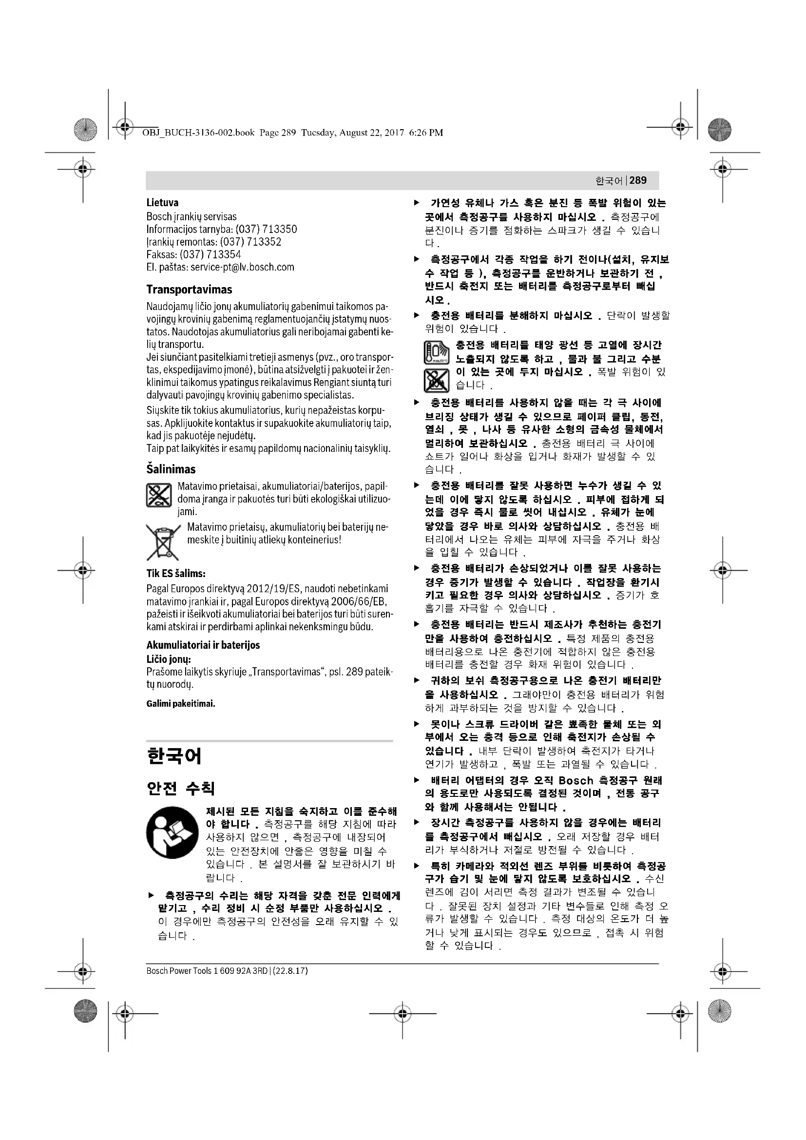 측정공구 , 충전용 배터리 / 배터리 , 액세서리 및 포장은 친환경적으로 재활용됩니다 . 측정공구와 배터리 팩 / 배터리를 가정용 쓰레 기로 처리하지 마십시오 ! EU 국가만 해당 : 측정공구 폐품에 관한 EU 지침 2012/19/EU 에 따라 , 그리고 EU 지침 2006/66/EC 에 따라 고장나거나 소 모된 배터리 팩 / 배터리는 분리 수거하여 환경 친화적 인 방법으로 재활용하도록 해야 합니다 . 충전용 배터리 / 배터리 : Li-Ion: “ 운반 ” 내용에 나와 있는 주의 사항을 준수하십시오 (298 페이지 ). 위 사항은 사전 예고 없이 변경될 수 있습니다 . 해당 무선설비는 전파혼신 가능성이 있으므로 인명안전 과 관련된 서비스는 할 수 없습니다 . OBJ_BUCH-3136-002.book Page 298 Tuesday, August 22, 2017 6:26 PMﻲﺑﺮﻋ | 299 Bosch Power Tools 1 609 92A 3RD | (22.8.17) ﺔﻳدﻮﻌﺴﻟا ﺔﻴﺑﺮﻌﻟا ﺔﻜﻠﻤﻤﻟا ﺔﻴﻨﻔﻟا تاﺪﻌﻤﻠﻟ ﻪﻧاﻮﺧأو ﻲﻟﺎﻔﺠﻟا ﻢﻴﻫاﺮﺑإ