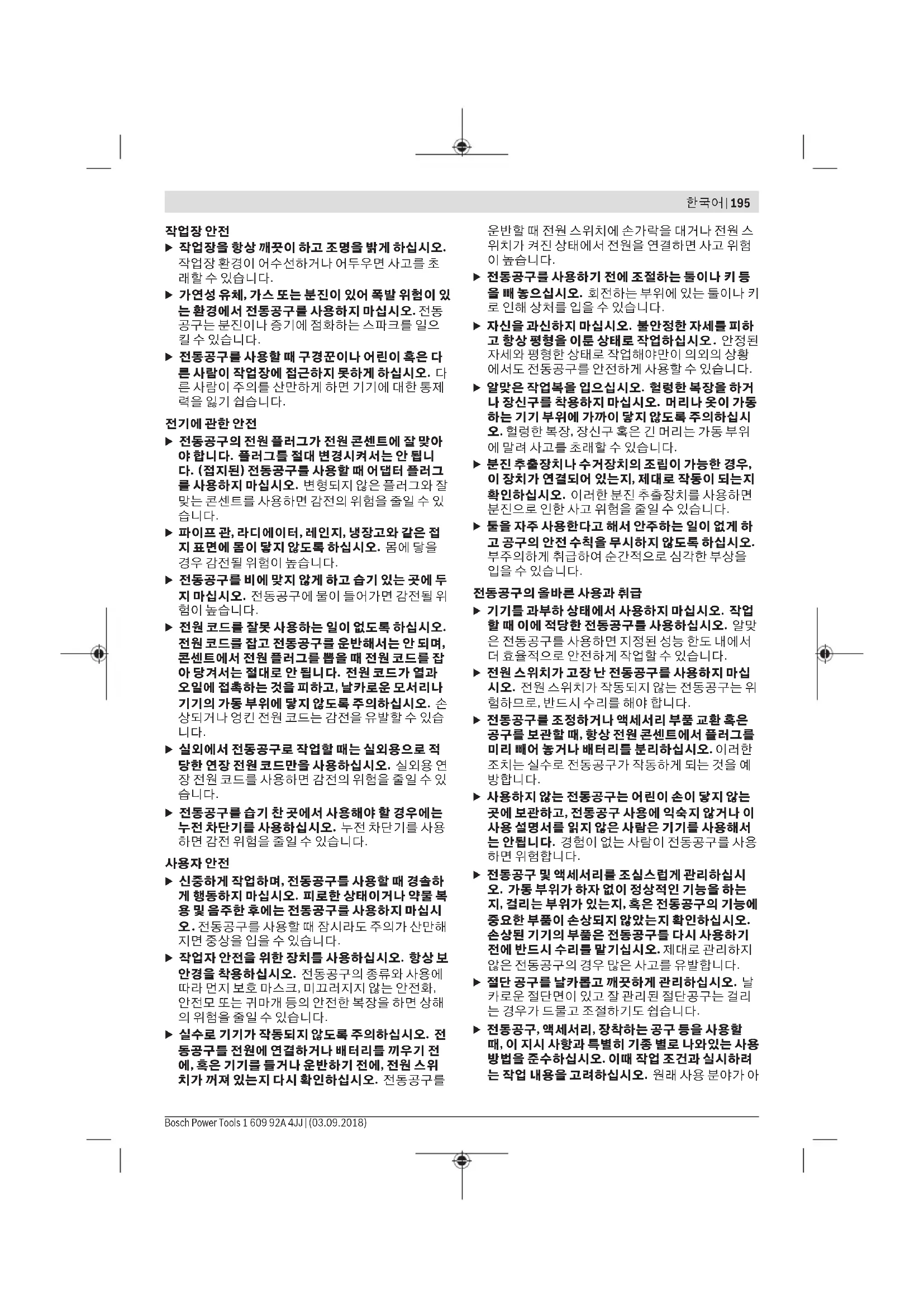 u 전동공구 및 액세서리를 조심스럽게 관리하십시 오. 가동 부위가 하자 없이 정상적인 기능을 하는 지, 걸리는 부위가 있는지, 혹은 전동공구의 기능에 중요한 부품이 손상되지 않았는지 확인하십시오. 손상된 기기의 부품은 전동공구를 다시 사용하기 전에 반드시 수리를 맡기십시오. 제대로 관리하지 않은 전동공구의 경우 많은 사고를 유발합니다. u 절단 공구를 날카롭고 깨끗하게 관리하십시오. 날 카로운 절단면이 있고 잘 관리된 절단공구는 걸리 는 경우가 드물고 조절하기도 쉽습니다. u 전동공구, 액세서리, 장착하는 공구 등을 사용할 때, 이 지시 사항과 특별히 기종 별로 나와있는 사용 방법을 준수하십시오. 이때 작업 조건과 실시하려 는 작업 내용을 고려하십시오. 원래 사용 분야가 아 한국어 | 195 Bosch Power Tools 1 609 92A 4JJ | (03.09.2018)196 | 한국어 1 609 92A 4JJ | (03.09.2018) Bosch Power Tools 닌 다른 작업에 전동공구를 사용할 경우 위험한 상 황을 초래할 수 있습니다. u 손잡이 및 잡는 면을 건조하게 유지하고, 오일 및 그 리스가 묻어 있지 않도록 깨끗하게 하십시오. 손잡 이 또는 잡는 면이 미끄러우면 예상치 못한 상황에 서 안전한 취급 및 제어가 어려워집니다. 충전 전동공구의 올바른 사용과 취급 u 배터리를 충전할 때 제조 회사가 추천하는 충전기 만을 사용하여 재충전해야 합니다. 특정 제품의 배 터리를 위하여 제조된 충전기에 적합하지 않은 다 른 배터리를 충전할 경우 화재 위험이 있습니다. u 각 전동공구용으로 나와있는 배터리만을 사용하십 시오. 다른 종류의 배터리를 사용하면 상해를 입거 나 화재를 초래할 수 있습니다. u 배터리를 사용하지 않을 때는, 각 극을 자극 할 수 있는 페이퍼 클립, 동전, 열쇠, 못, 나사 등 유사한 금 속성 물체와 멀리하여 보관하십시오. 배터리 극 사 이에 쇼트가 일어나 화상을 입거나 화재를 야기할