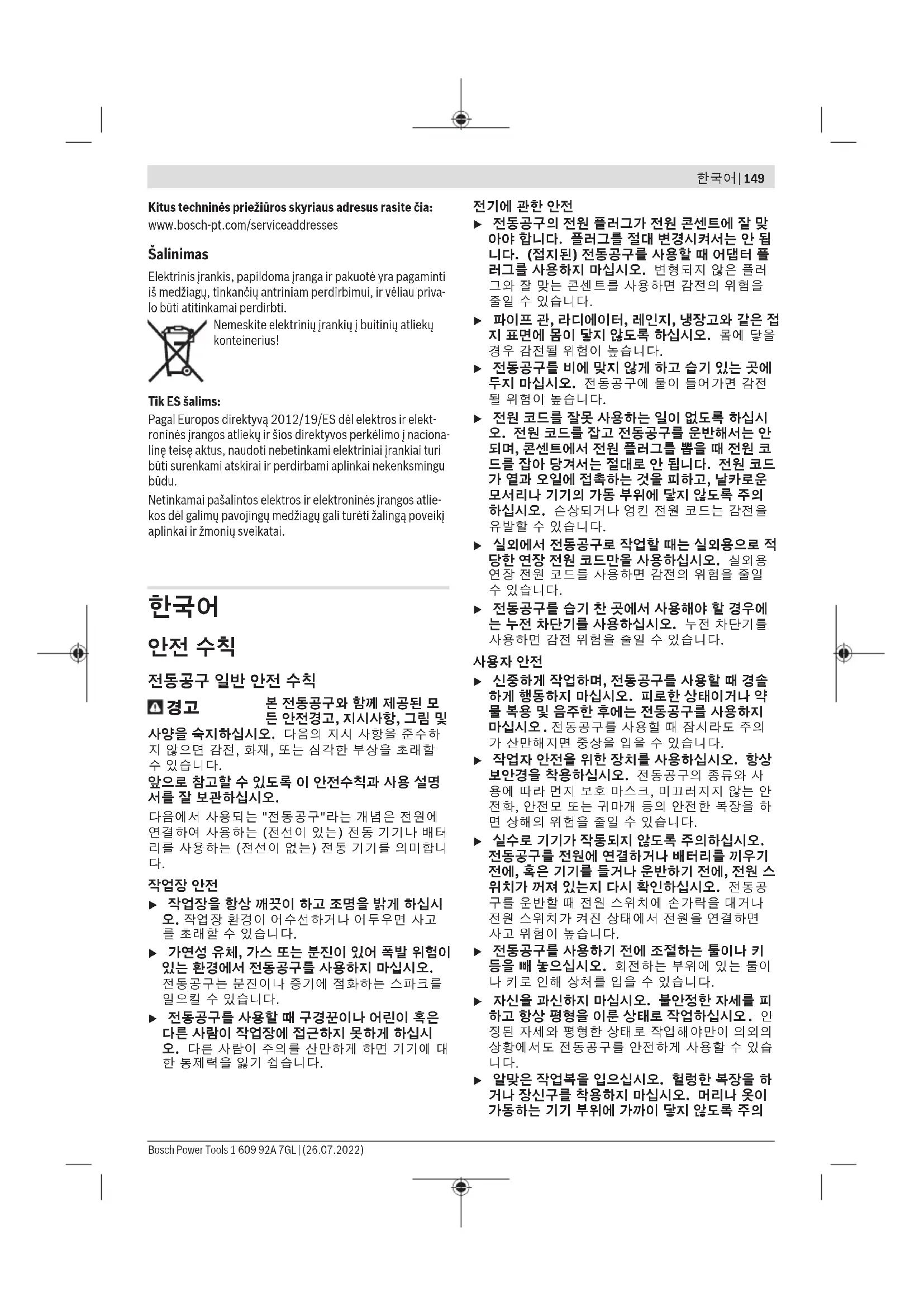 드릴 척 교체하기 (그림 C 참고) u 전동공구를 보수 정비하기 전에 반드시 콘센트에 서 전원 플러그를 빼십시오. Bosch Power Tools 1 609 92A 7GL | (26.07.2022)152 | 한국어