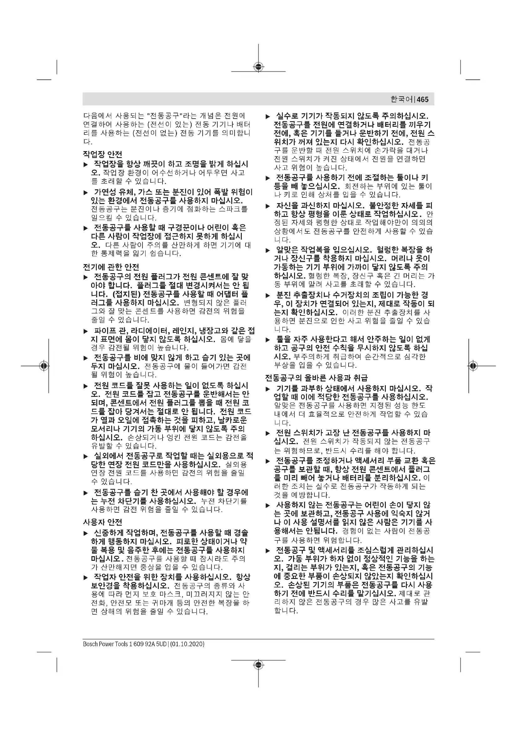 앞으로 참고할 수 있도록 이 안전수칙과 사용 설명 서를 잘 보관하십시오. 1 609 92A 5UD | (01.10.2020) Bosch Power Tools한국어 | 465 다음에서 사용되는 "전동공구"라는 개념은 전원에 연결하여 사용하는 (전선이 있는) 전동 기기나 배터 리를 사용하는 (전선이 없는) 전동 기기를 의미합니