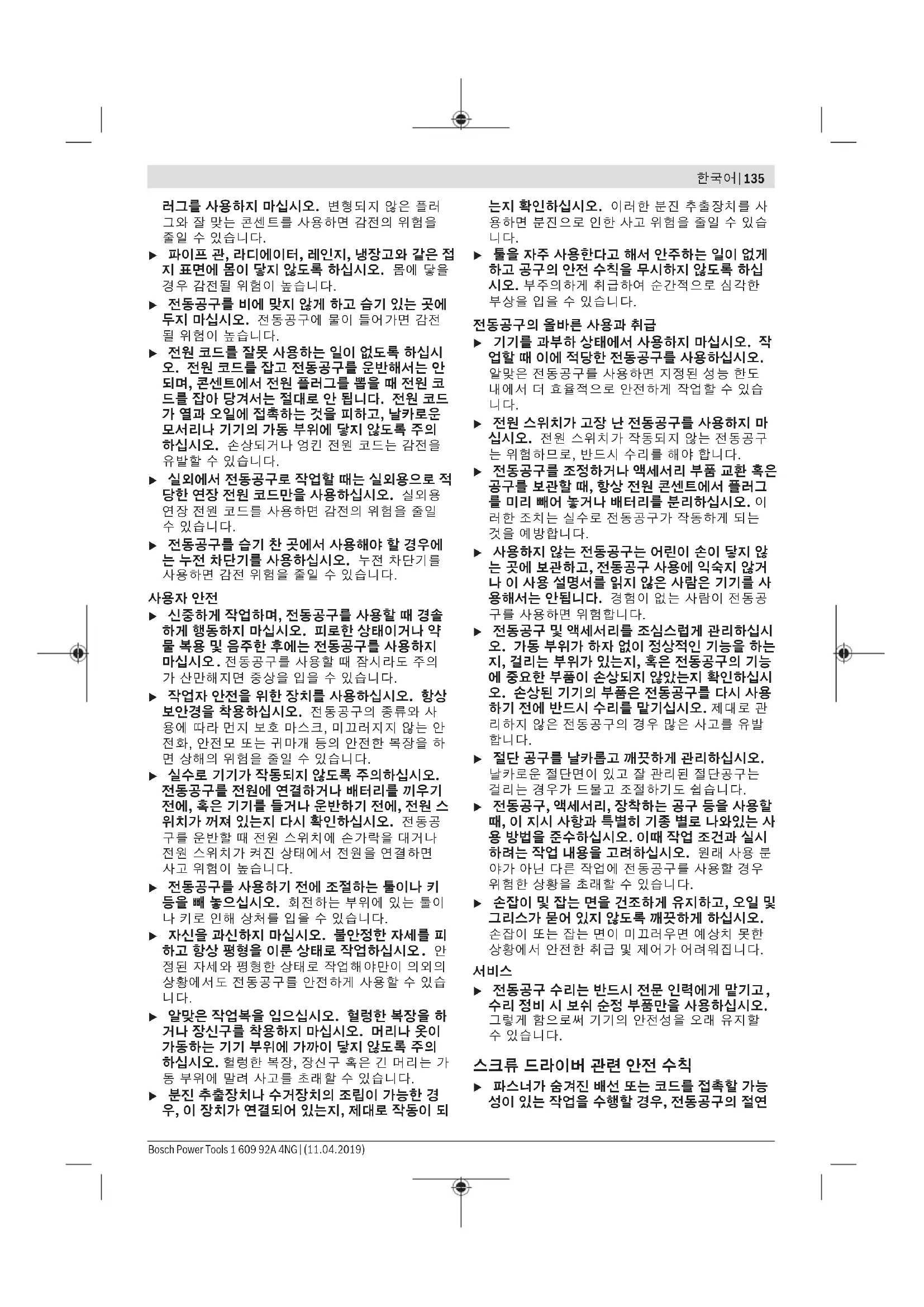 스크류 드라이버 관련 안전 수칙 u 파스너가 숨겨진 배선 또는 코드를 접촉할 가능 성이 있는 작업을 수행할 경우, 전동공구의 절연 Bosch Power Tools 1 609 92A 4NG | (11.04.2019)136 | 한국어 된 손잡이 면만 잡으십시오. 파스너가 "전류가 흐 르는" 전선에 접촉되면, 전동공구의 노출된 금속 부품에 "전류가 흐르는" 상태로 만들어 작업자가 감전될 수 있습니다. u 보이지 않는 부위에 에너지 배선 및 배관 여부를 확인하려면 적당한 탐지기를 사용하거나 담당 전 력 공급회사에 문의하십시오. 전선에 접하게 되 면 화재나 전기 충격을 야기할 수 있습니다. 가스 관을 손상시키면 폭발 위험이 있습니다. 수도관 을 파손하게 되면 재산 피해를 유발하거나 전기 충격을 야기할 수 있습니다. u 전동 공구를 잘 잡으십시오. 스크류를 조이거나 풀 때 잠깐 동안 높은 반력 토크가 발생할 수 있습